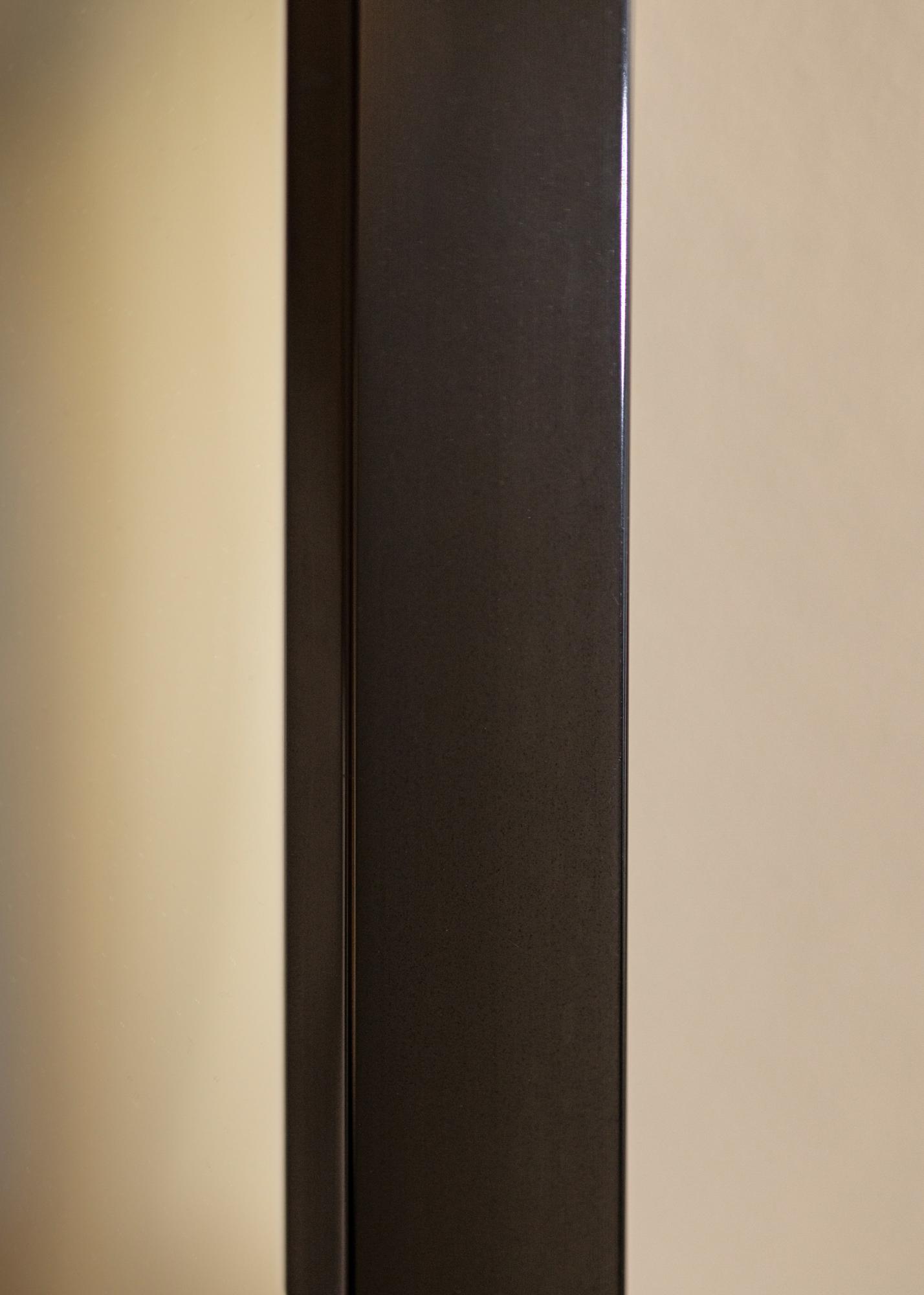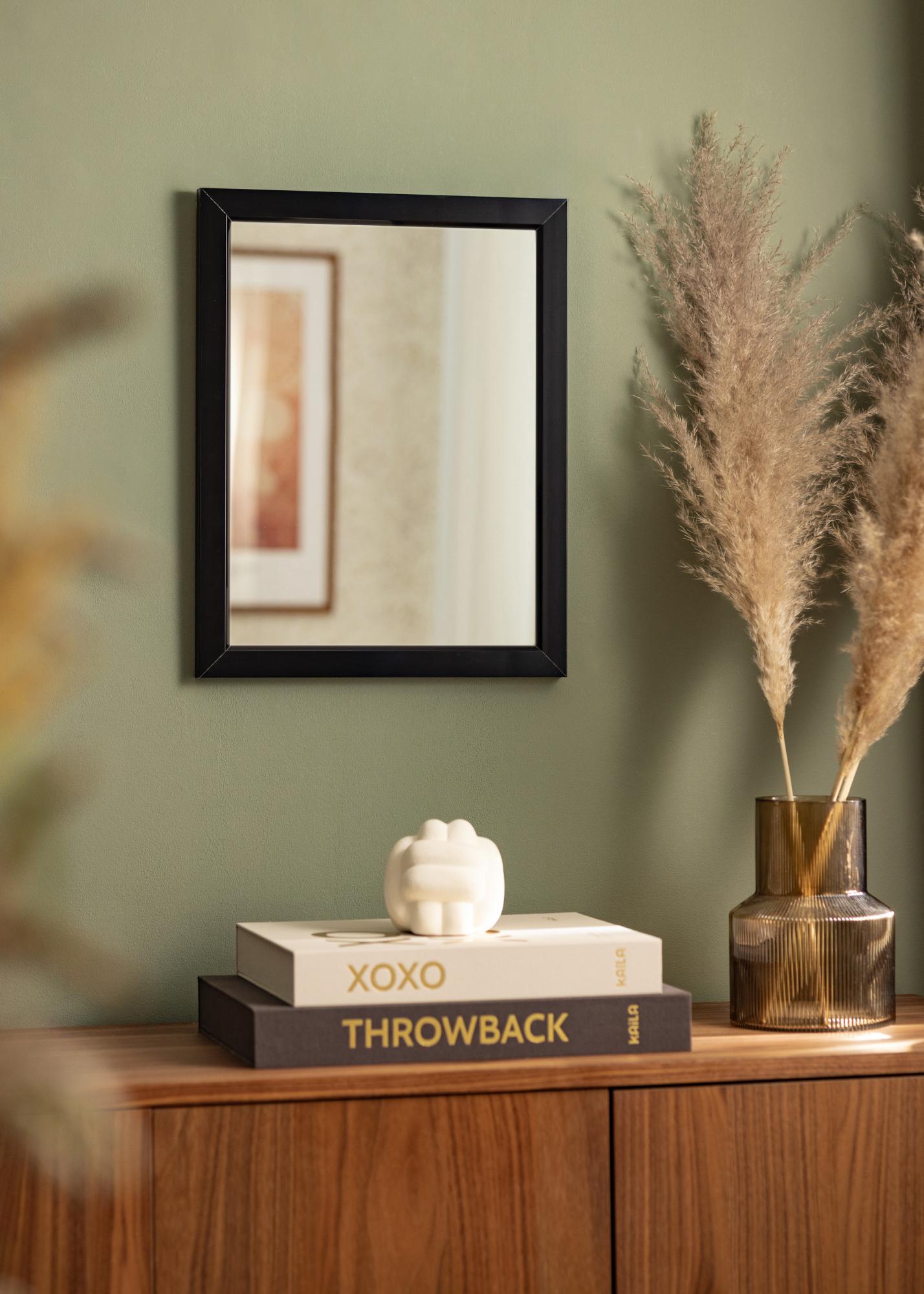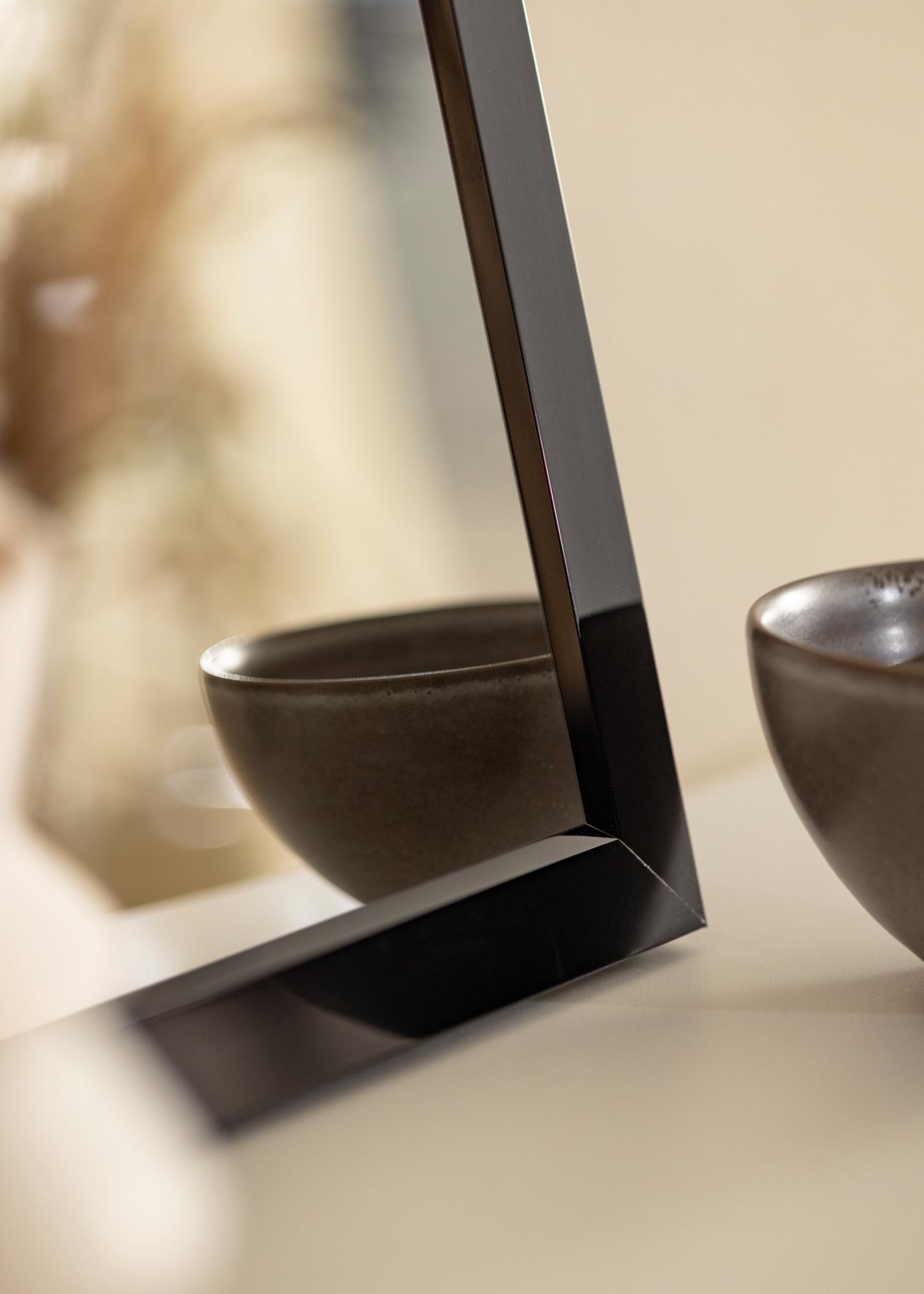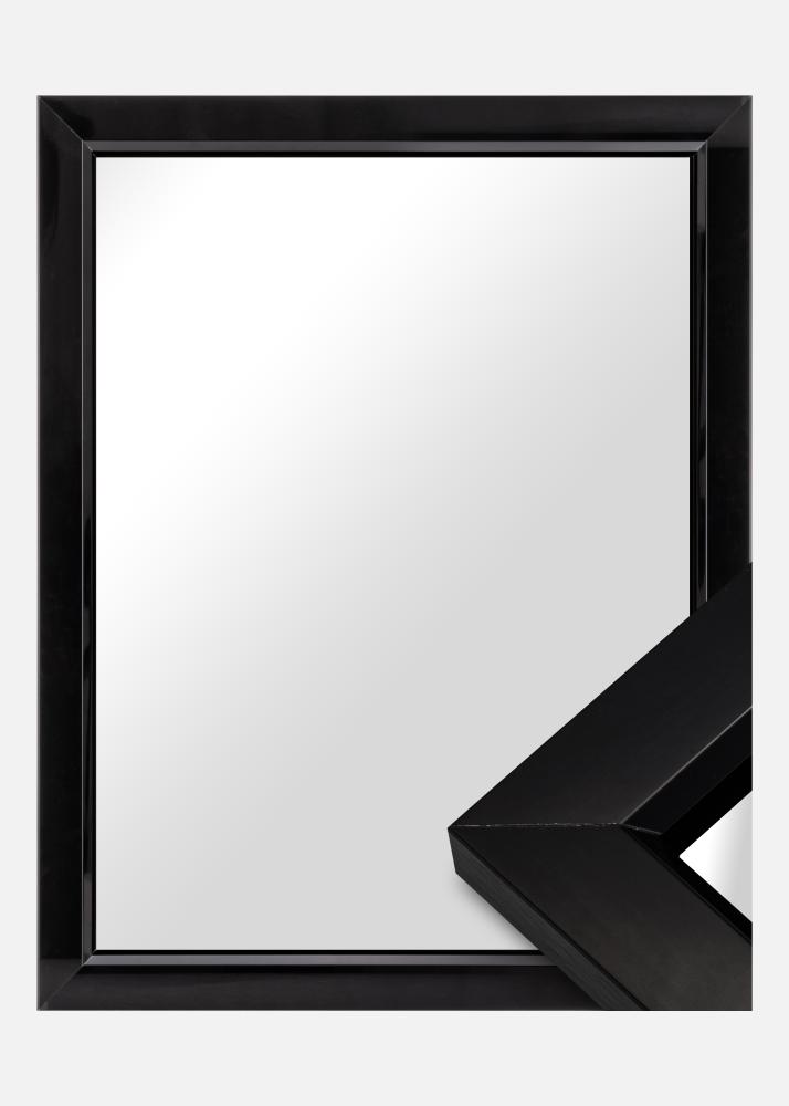 Čierne štýlové vysokolesklé zrkadlo, s rámom vyrobeným z hliníka, ktorý má vnútornú fazetu. Grafická zrkadlová maskulínna atmosféra môže priniesť vzrušujúci kontrast do jemnejšieho interiéru, ale lesklý lak tiež umožňuje, aby sa zrkadlo dobre hodilo do moderných priemyselných interiérov. Zaveste zrkadlo spolu s grafickými plagátmi alebo obrazmi s čiernymi rámami. Umiestnením oproti oknu sa vytvorí priestor v miestnosti.