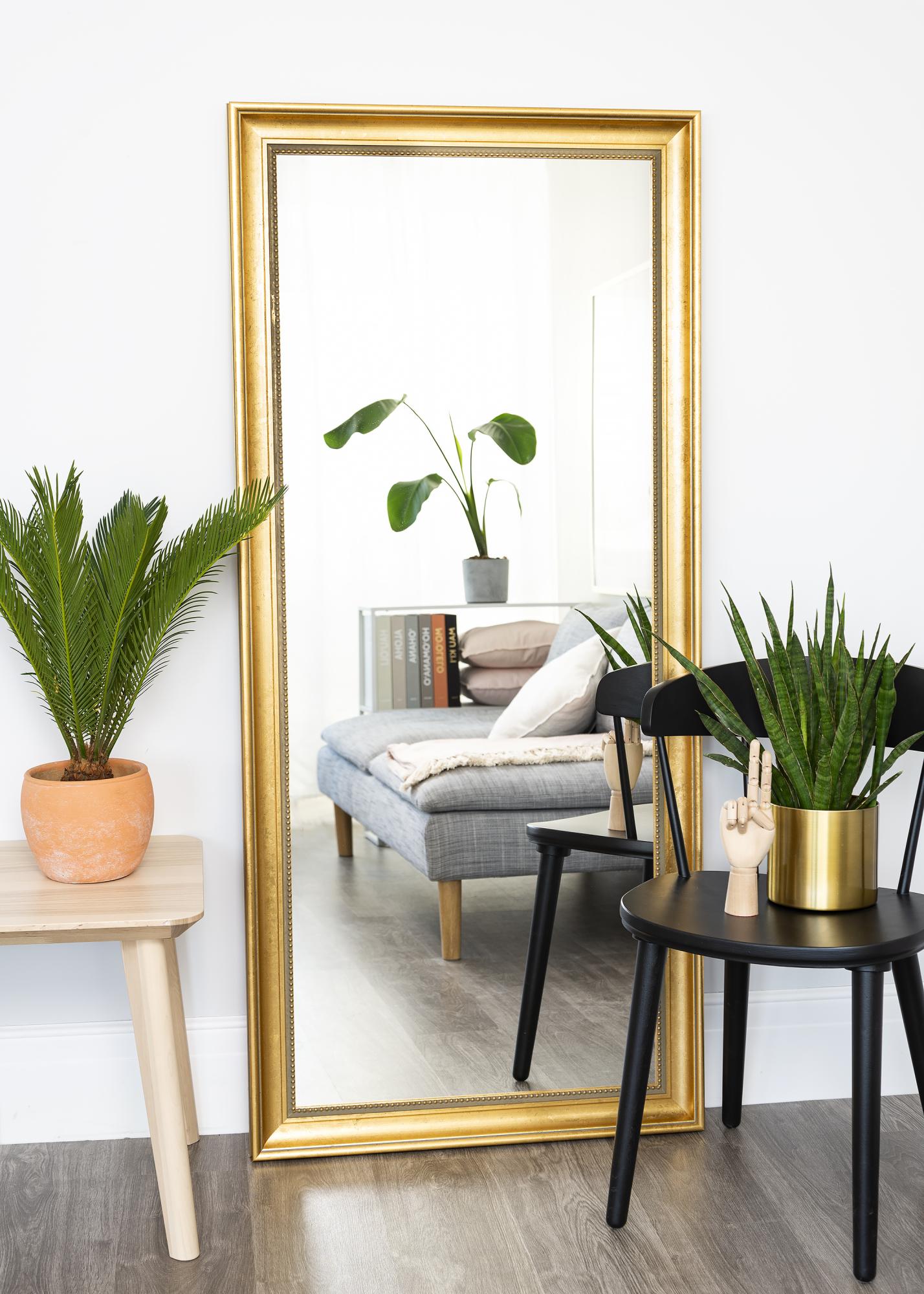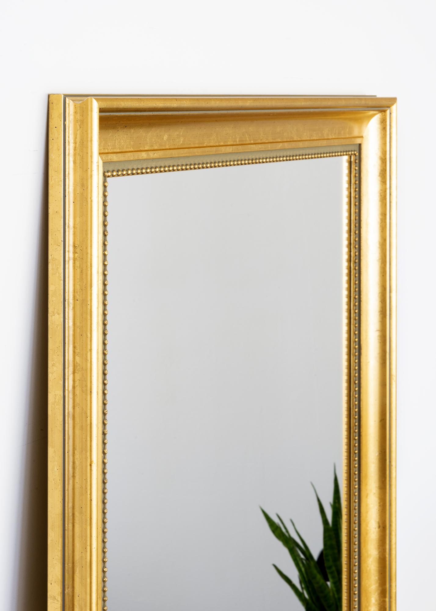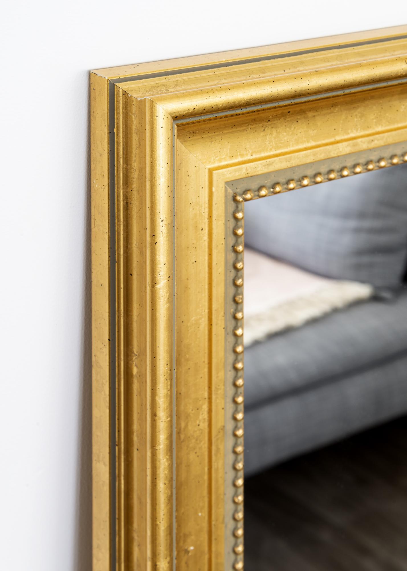 Zaobstarajte si elegantné zrkadlo a urobte interiér v hale, obývačke alebo kúpeľni extra luxusným. Toto štýlové zrkadlo je k dispozícii v niekoľkých rôznych veľkostiach, takže ľahko nájdete také, ktoré vyhovuje vašim konkrétnym požiadavkám. Rám zrkadla má klasický dizajn so širokým rámom a nenápadným perlovým vzorom blízko skla. Drevo pochádza z udržateľného lesného hospodárstva a je natreté v krásnej zlatej farbe.