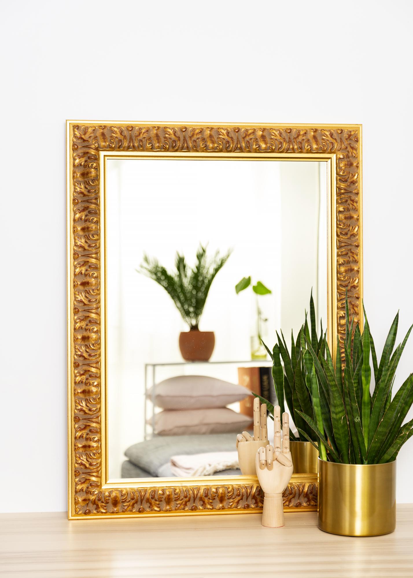 Dajte svojmu domovu luxusný nádych s dekoráciami, ktoré evokujú barok. Toto zrkadlo je vysokej kvality a má krásny barokový rám. Rám je vyrobený z dreva z udržateľného lesného hospodárstva a je natretý v rôznych odtieňoch zlata. Najbližšie ku sklu prebieha úzka, svetlá zlatá lišta. Keďže zrkadlo je dostupné v 7 rôznych veľkostiach, nájdete zrkadlo na toaletný stolík aj celotelové zrkadlo.