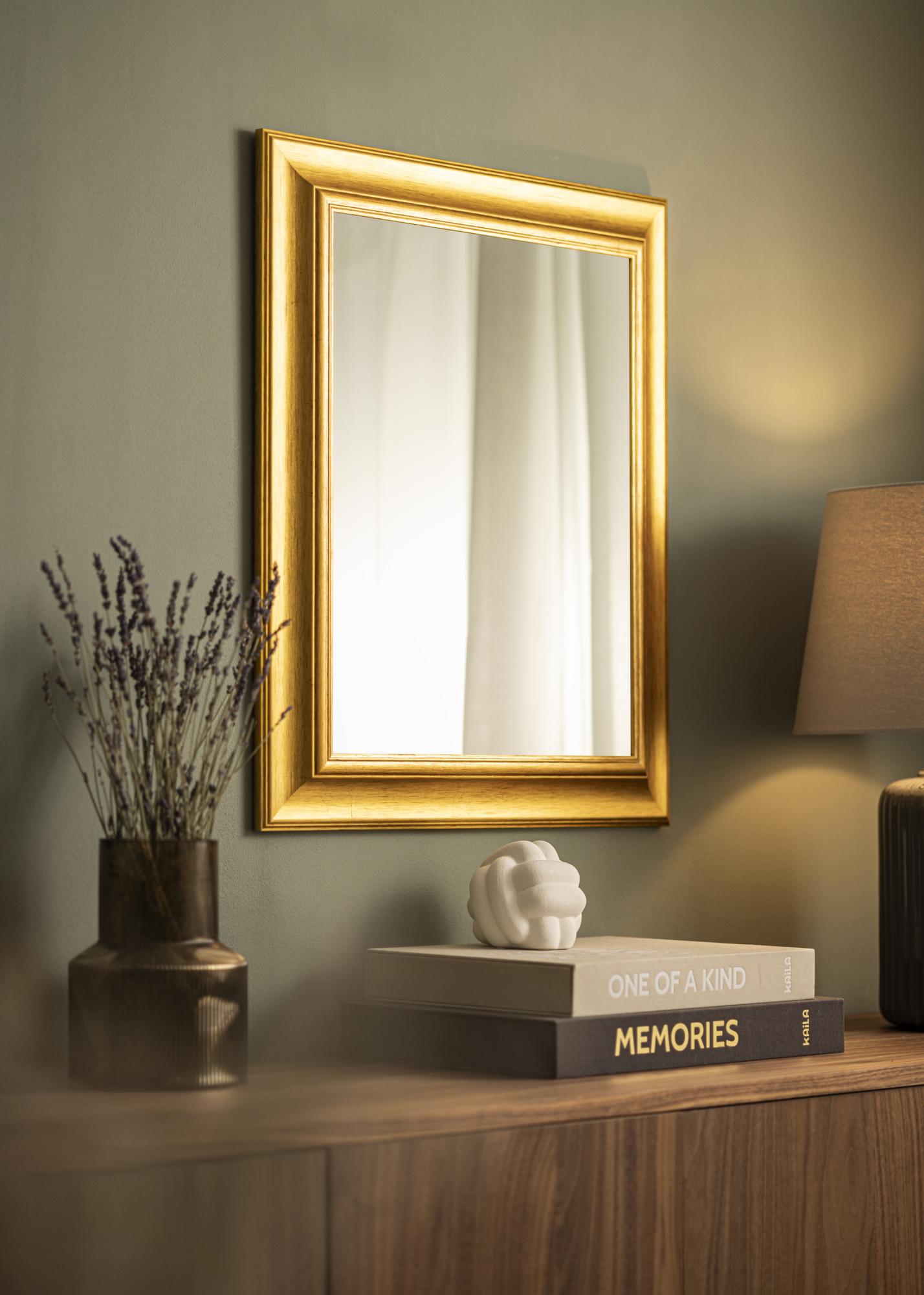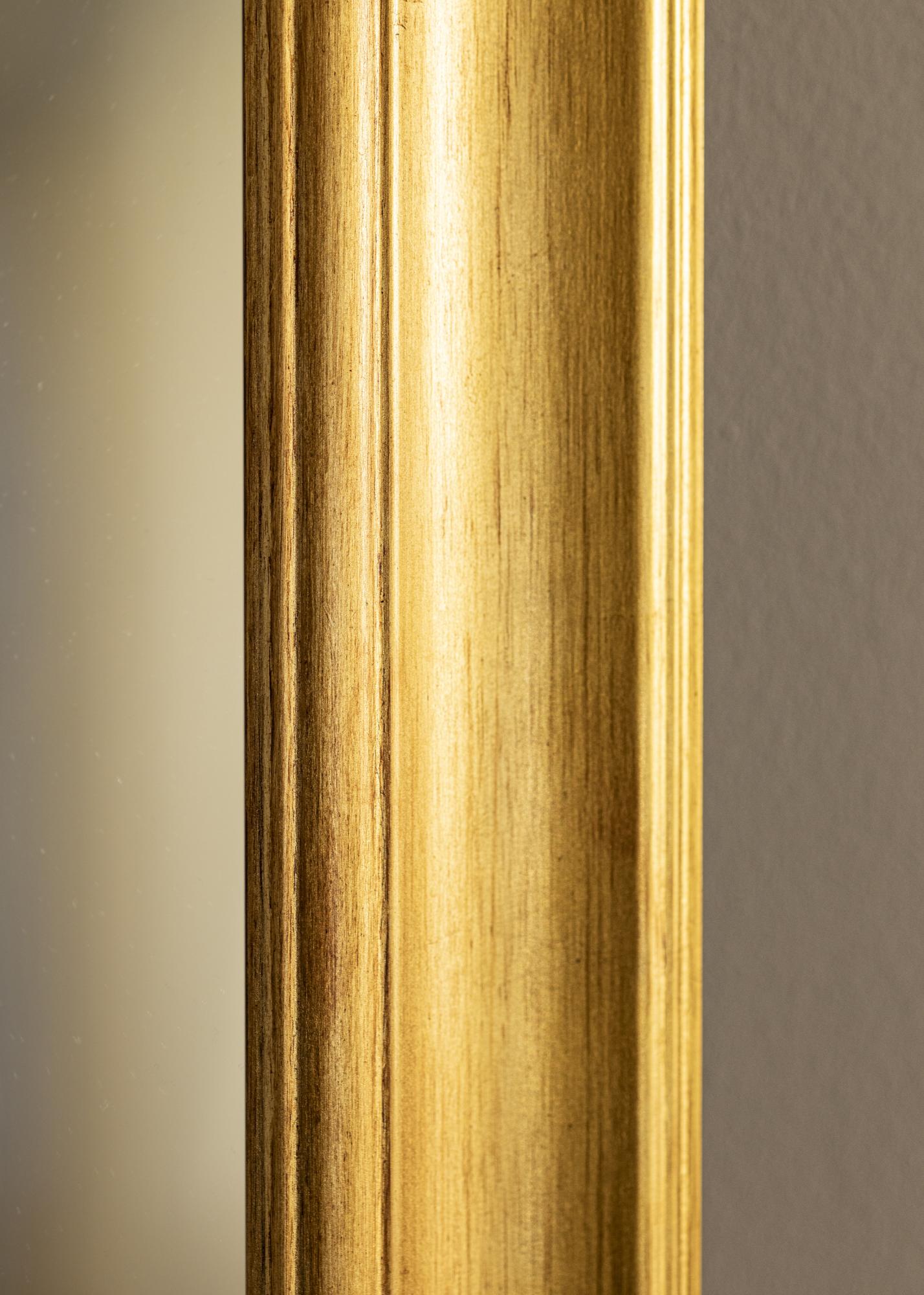 Rám je vyrobený z borovice a má krásny starožitný zlatý povrch. Kefovaná povrchová úprava s jemnými odtieňmi dodáva zrkadlu ľahko patinovaný vzhľad, čo prispieva k jeho jedinečnému charakteru. Tenké línie pozdĺž okrajov vytvárajú sofistikovanú detaily, ktorá priťahuje pozornosť a posilňuje klasický výraz zrkadla.