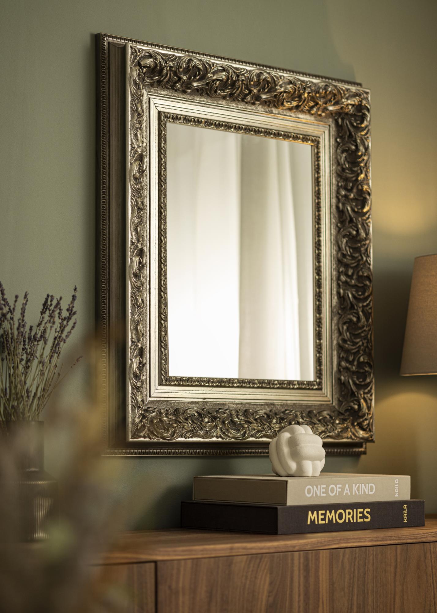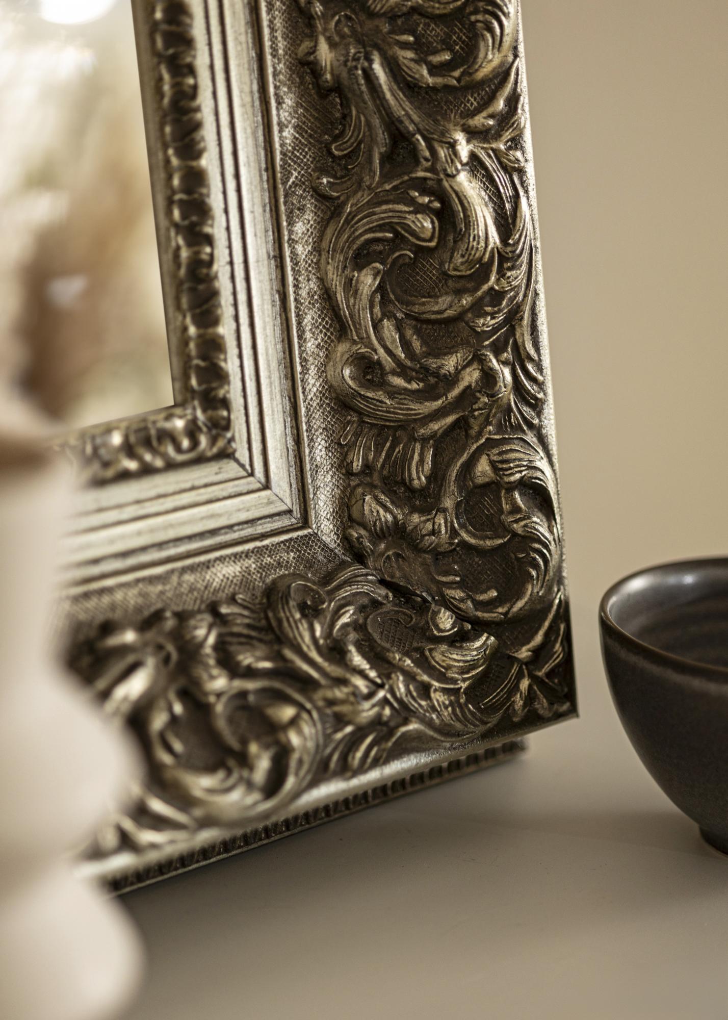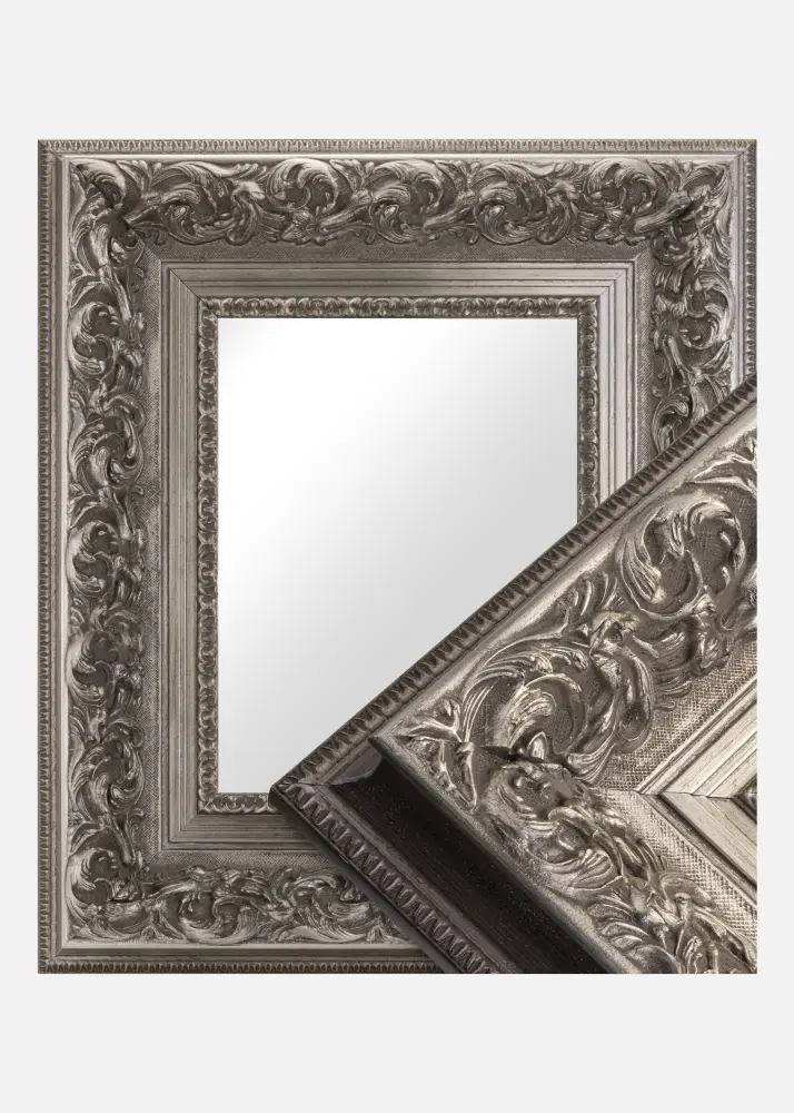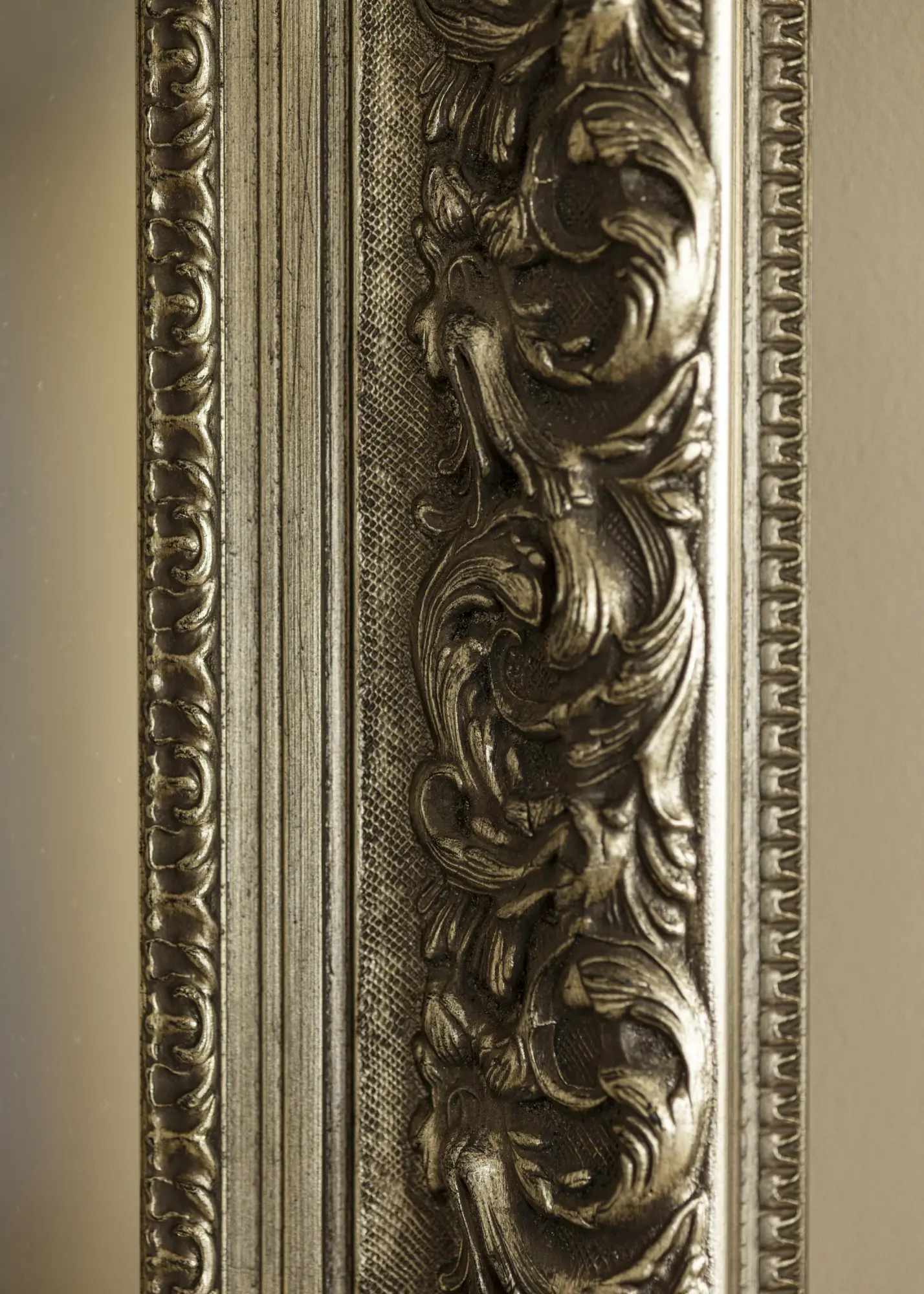 Prepracovanosť detailov na ráme zrkadla je zdôraznená hlbokou reliéfnosťou, kde vyrezávané listové vzory vytvárajú pocit elegancie a štýlu. Povrchová úprava rámu kombinuje tmavé a svetlé odtiene striebra, čo zrkadlu dodáva krásnu patinu a nadčasovú estetiku. Táto kombinácia farieb a vzorov robí zrkadlo perfektnou voľbou pre klasické motívy a zarámovania, ktoré vyžadujú niečo extra.