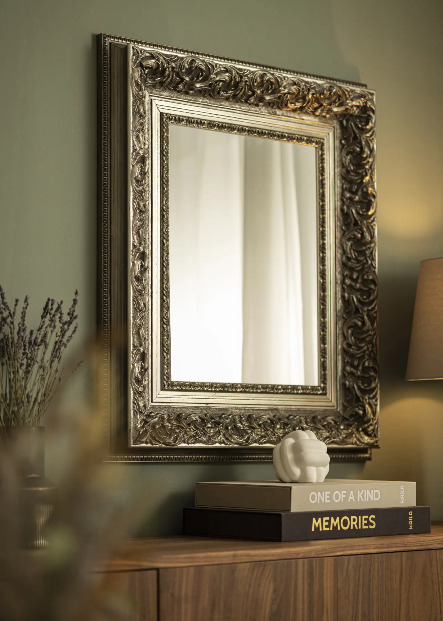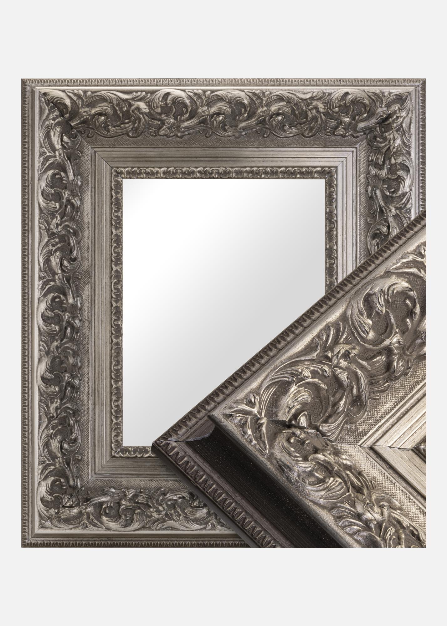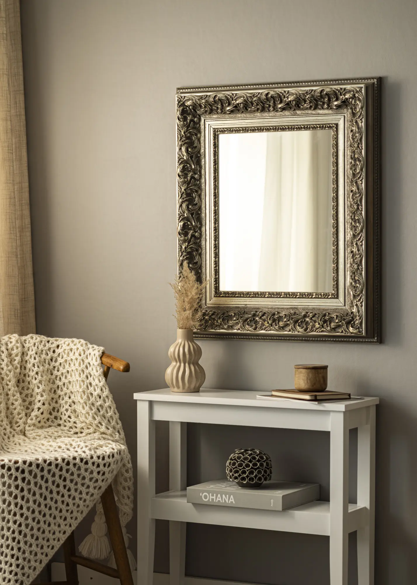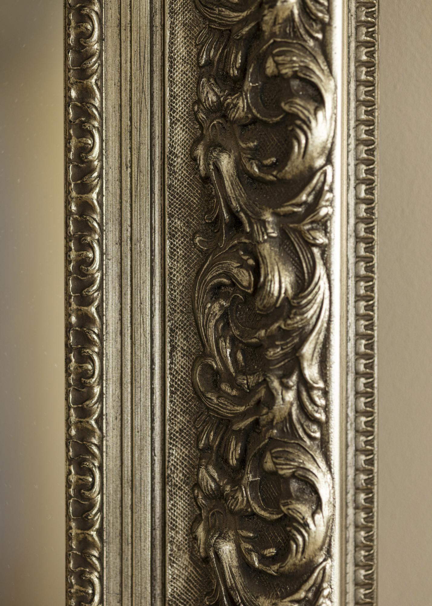 Zrkadlo Birmingham Silver je zrkadlo na mieru, ktoré vyrábame my, čo vám dáva možnosť získať ho v presne tých rozmeroch, ktoré si želáte. S jeho pôsobivou rámovou lištou so šírkou 152 mm a hĺbkou 74 mm sa toto zrkadlo stane nápadným detailom v akejkoľvek miestnosti, kam sa umiestni. Rám je vyrobený z borovice a má bohato ornamentálny dizajn v antickom striebre, čo dáva zrkadlu jedinečný charakter.