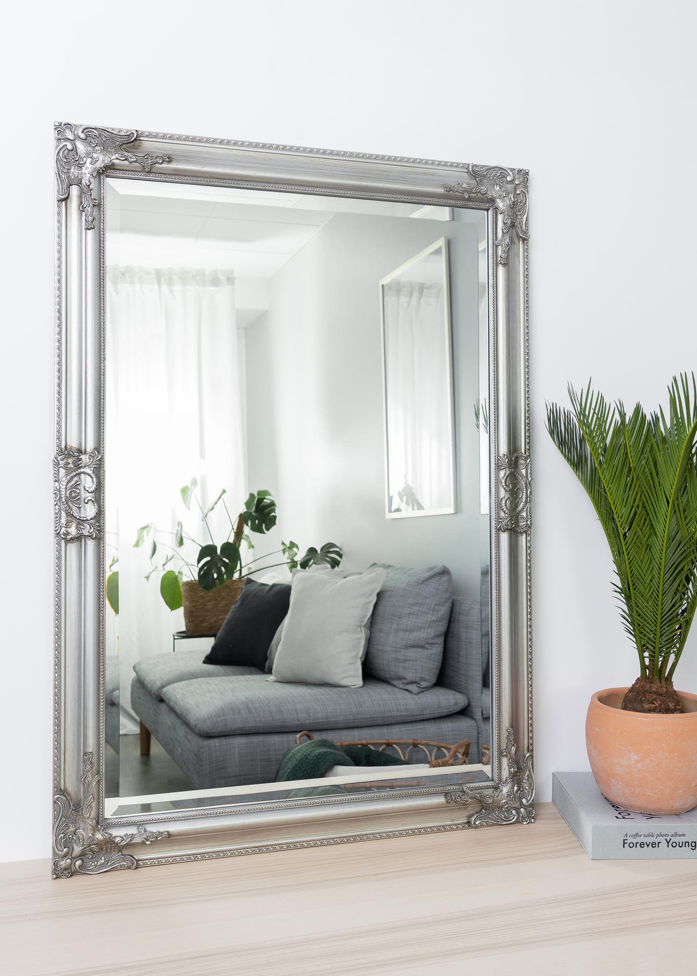 Zrkadlová séria Bologna Silver má latinský dizajn s bohatou dekoráciou v rohoch a stredoch strán rámu. O niečo užší rám ako mnoho iných zrkadiel v tomto štýle. Rám je vyrobený z dreva a dekorácia bola odliata zo sadry pred aplikáciou na rám.