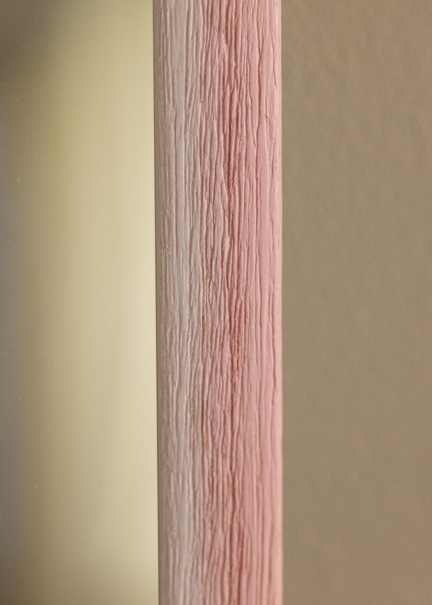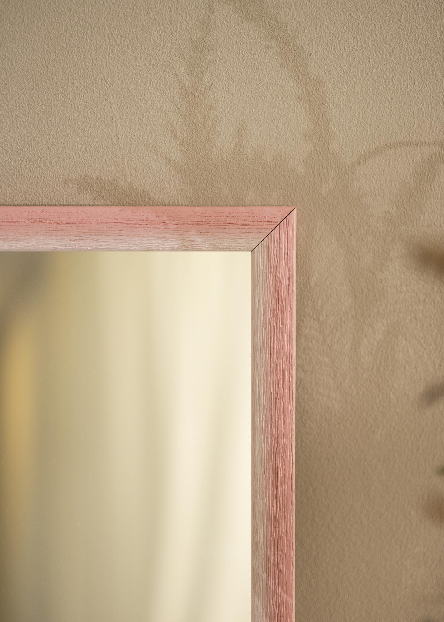 Rám zrkadla Cornwall Ružová je široký 23 mm a má hĺbku 13 mm, čo mu dodáva pevnú a robustnú povahu. Vyrobený z ayousového dreva, rám zdôrazňuje prirodzenú drevnú štruktúru s hlbokými žilkami, ktoré zrkadlu dodávajú rustikálny a zemný charakter. Ručne maľovaný efekt je vytvorený jemným farebným prechodom, čo dáva rámu živý a dynamický výraz.