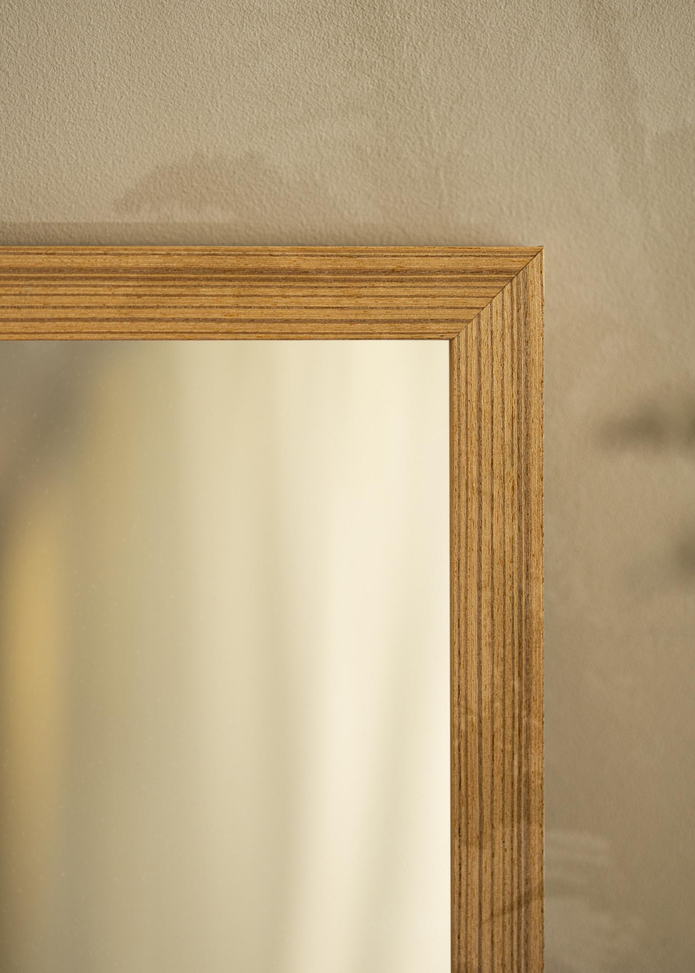 Rám zrkadla má šírku 28 mm a hĺbku 33 mm, čo zabezpečuje stabilný a robustný pocit. Vyrobené z borovice, toto zrkadlo ponúka trvácnosť, ktorá pretrváva časom. Vyznačená štruktúra rámu vytvára živú hĺbku a dodáva taktilný rozmer, ktorý robí, že zrkadlo pôsobí živo a dynamicky.