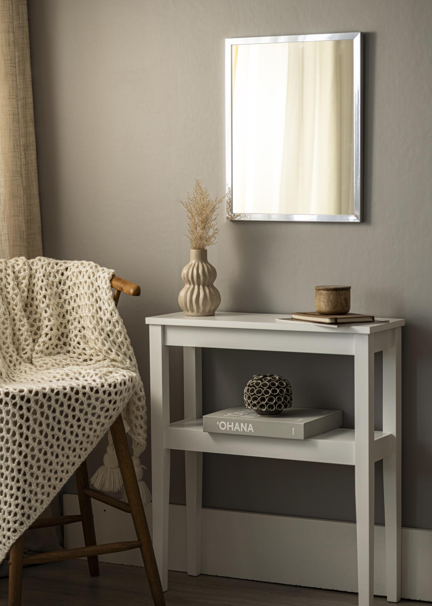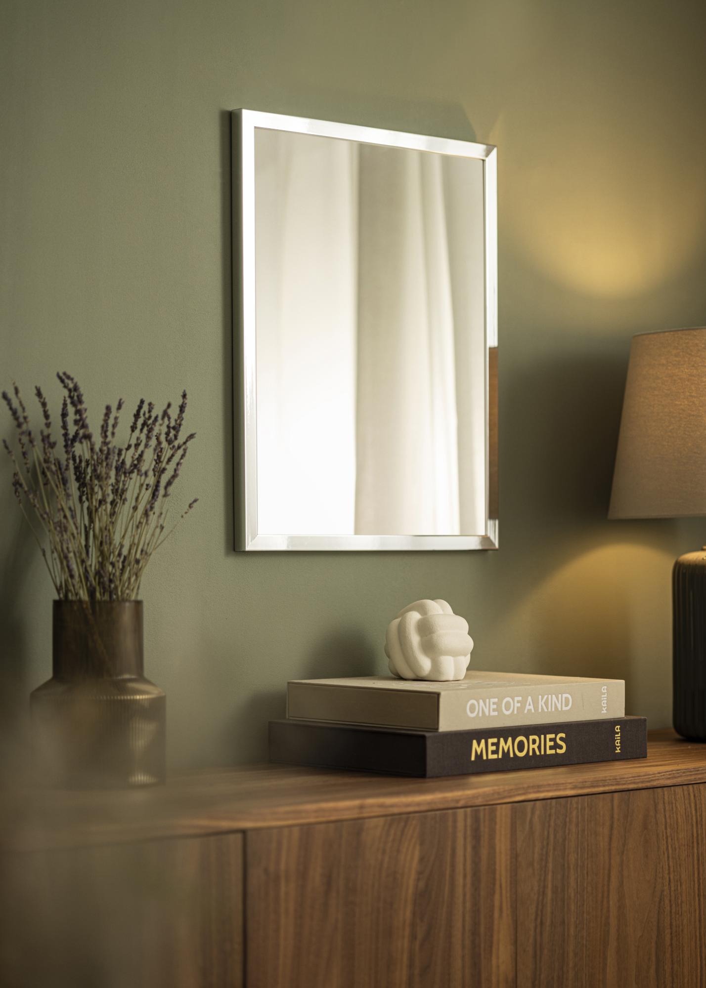 Zrkadlo Devon Silver je na mieru vyrobené zrkadlo, ktoré vyrábame my, čo znamená, že ho môžete získať presne v takých rozmeroch, ktoré najlepšie vyhovujú vášmu domovu. So svojou elegantnou striebornou povrchovou úpravou a zrkadlovým leskom sa stáva štýlovým prvkom v každej miestnosti. Odráža svetlo spôsobom, ktorý vytvára modernú a prívetivú atmosféru, ideálnu na dodanie pocitu priestoru a svetla do miestnosti.