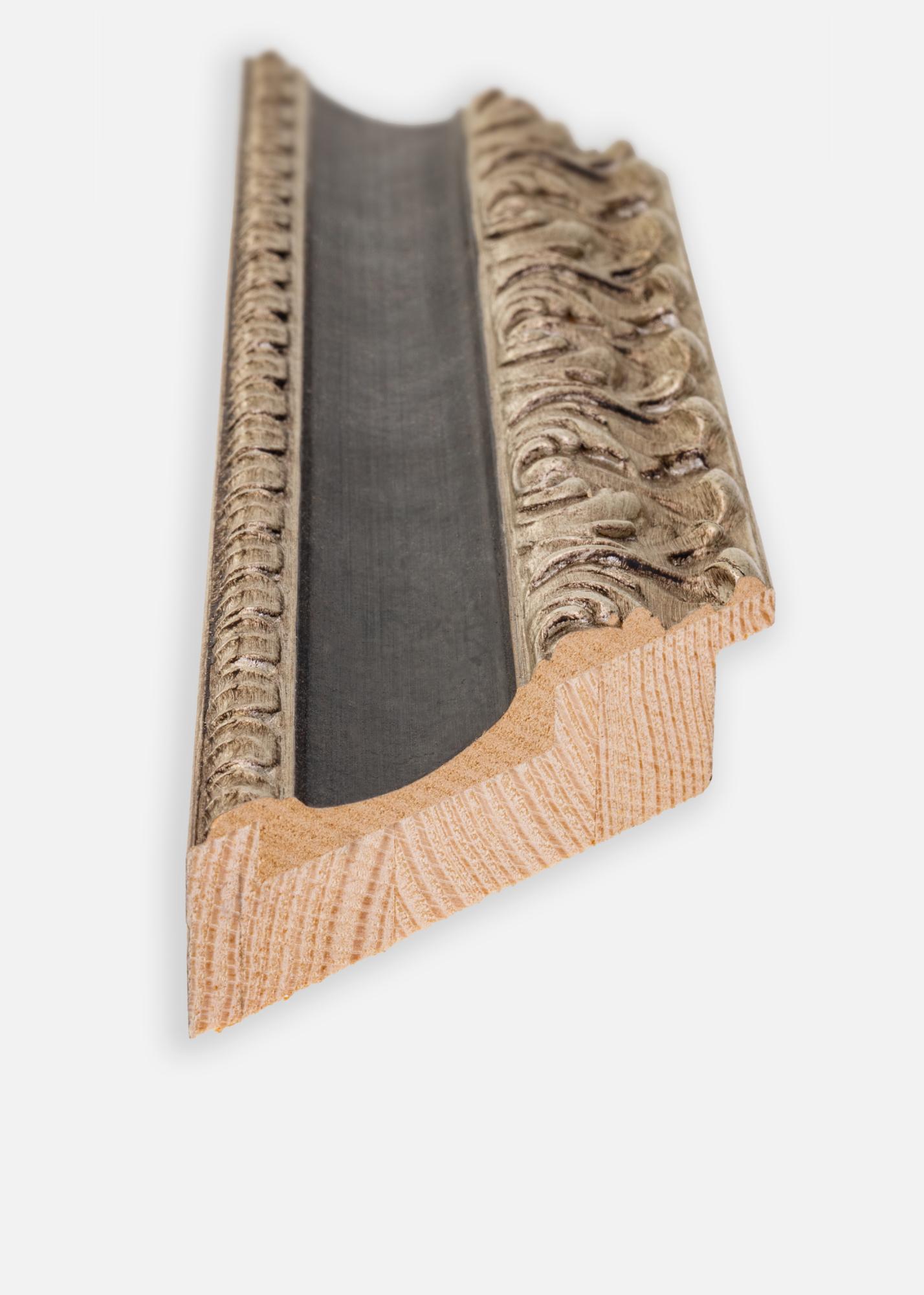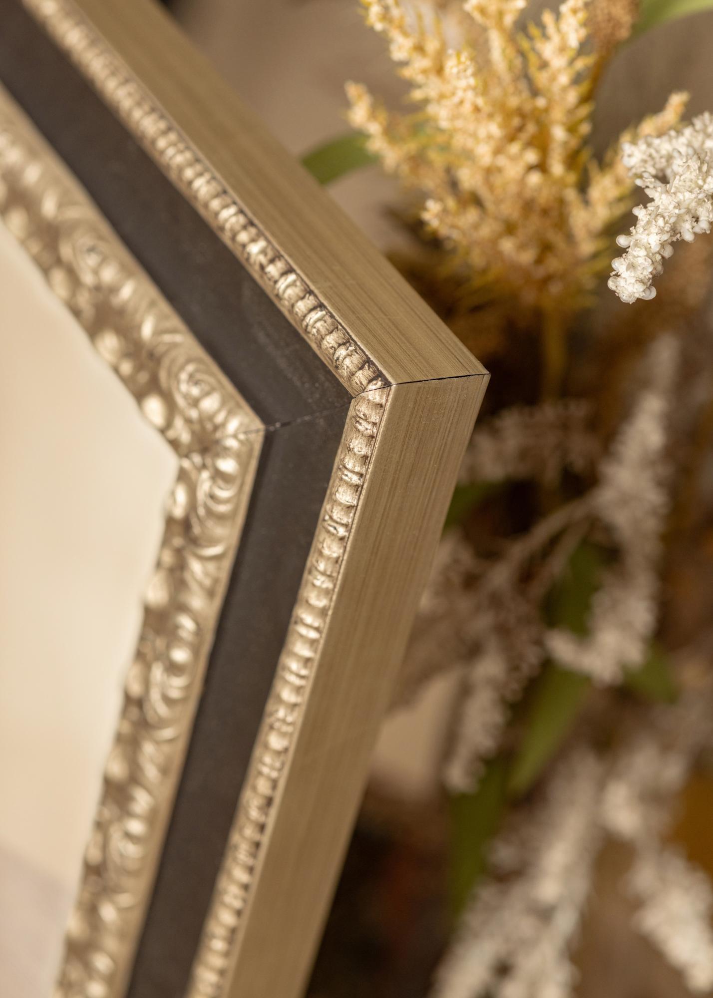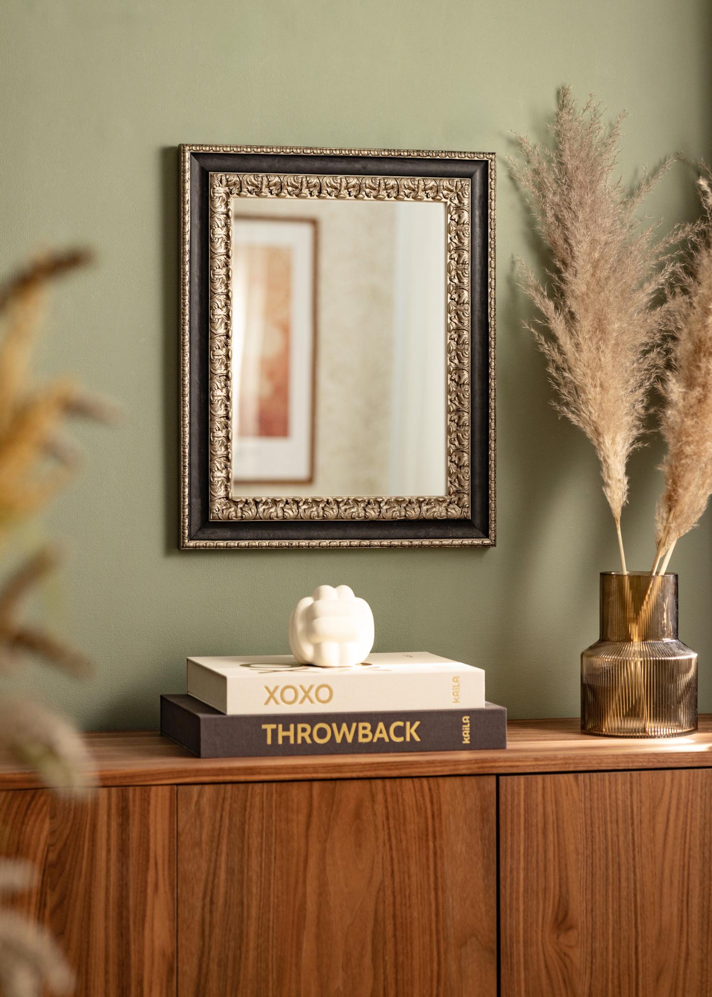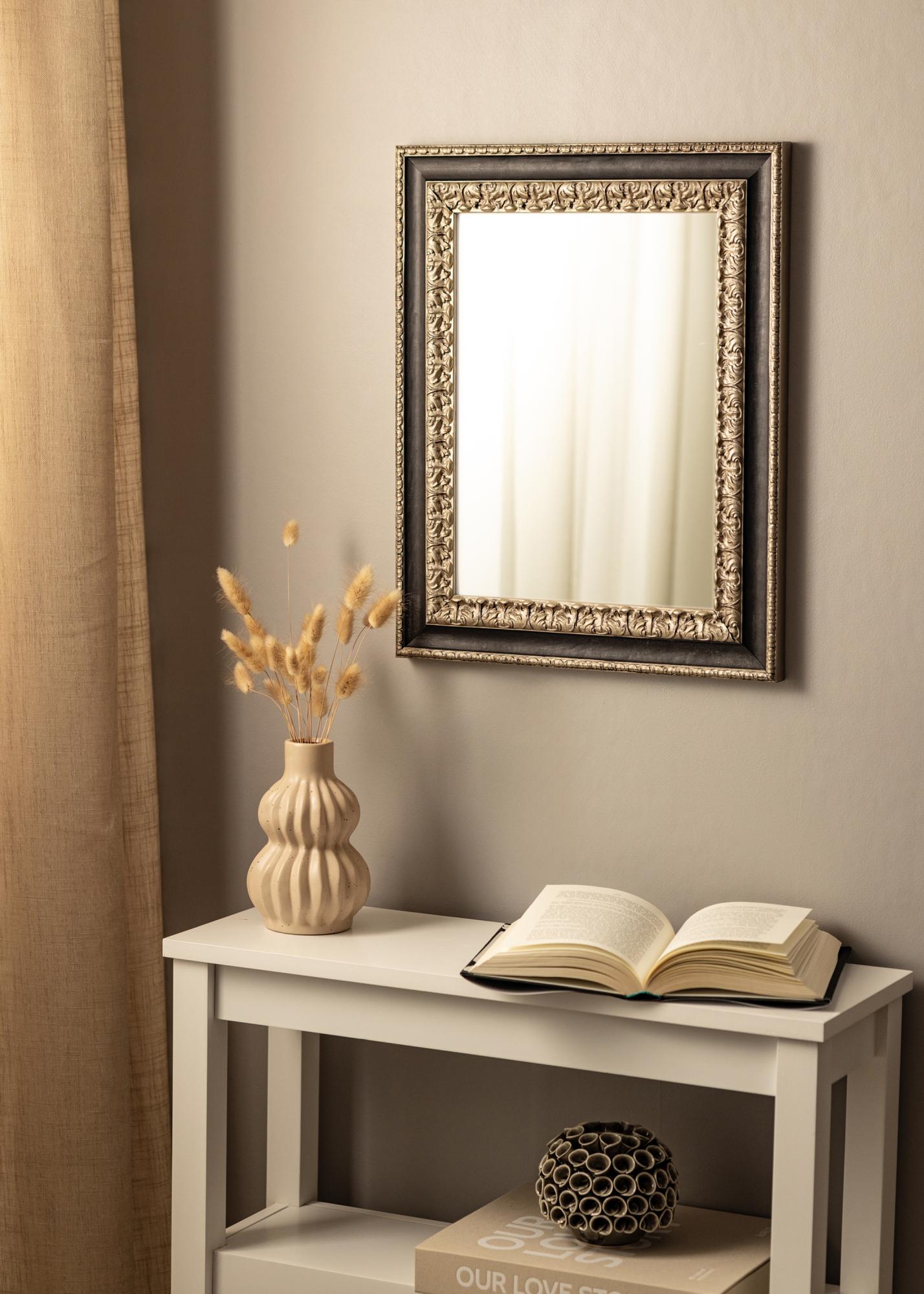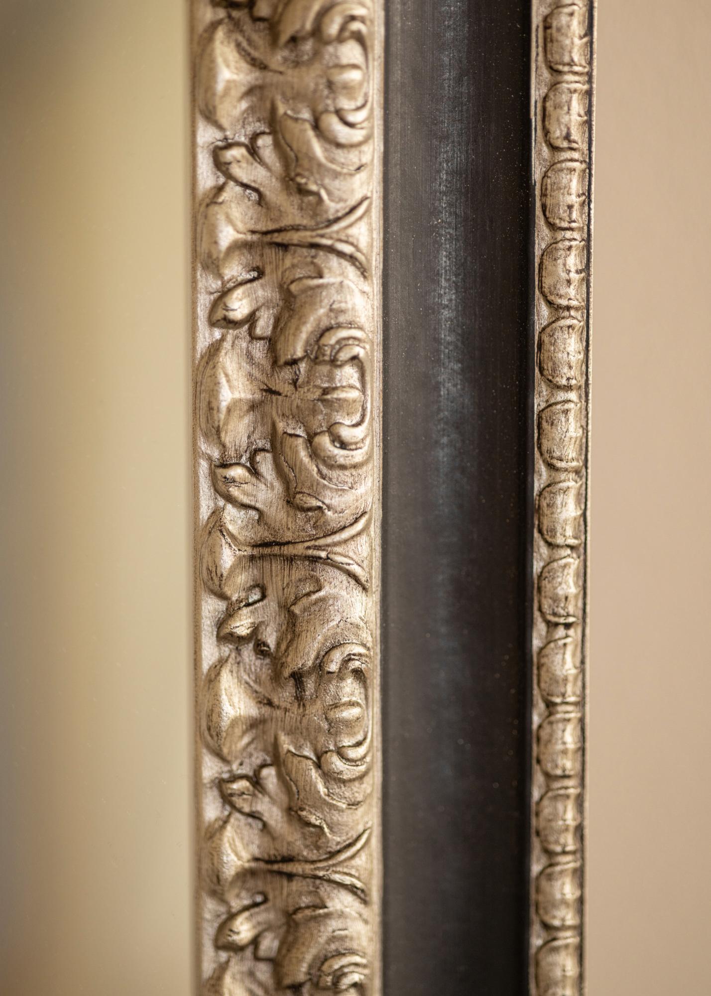 "Drottningholm Silver" je krásne retro zrkadlo z Talianska z prstovým spojom vyrobeným z borovice, ktoré je ručne maľované. Zrkadlo má bohato zdobený strieborný profil so širokým čiernym okrajom, ktorý dáva rámu jeho elegantný pocit.