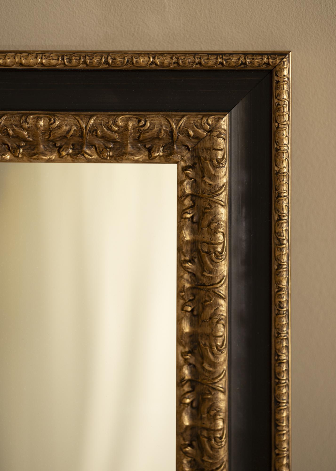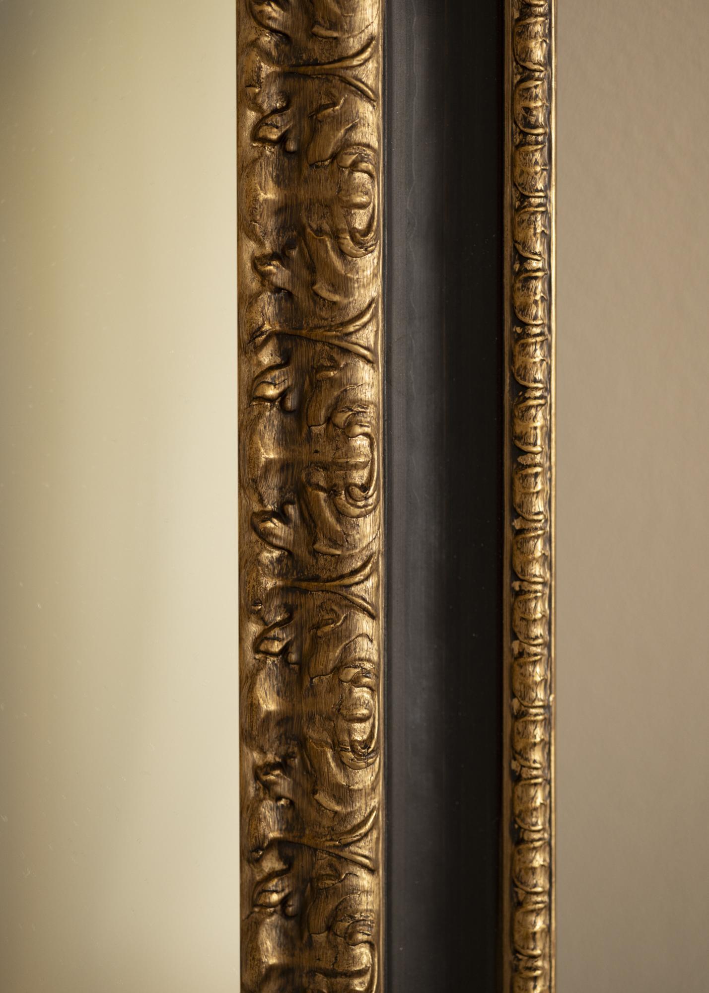 "Drottningholm Guld" je krásne zrkadlo v retro štýle z Talianska z lepeného smrekovca, ktoré je ručne maľované. Zrkadlo má bohato zdobený zlatý profil so širokým čiernym okrajom, ktorý dodáva rámu elegantný pocit.