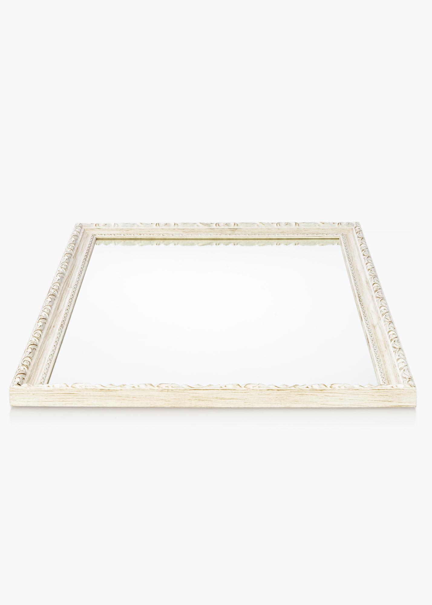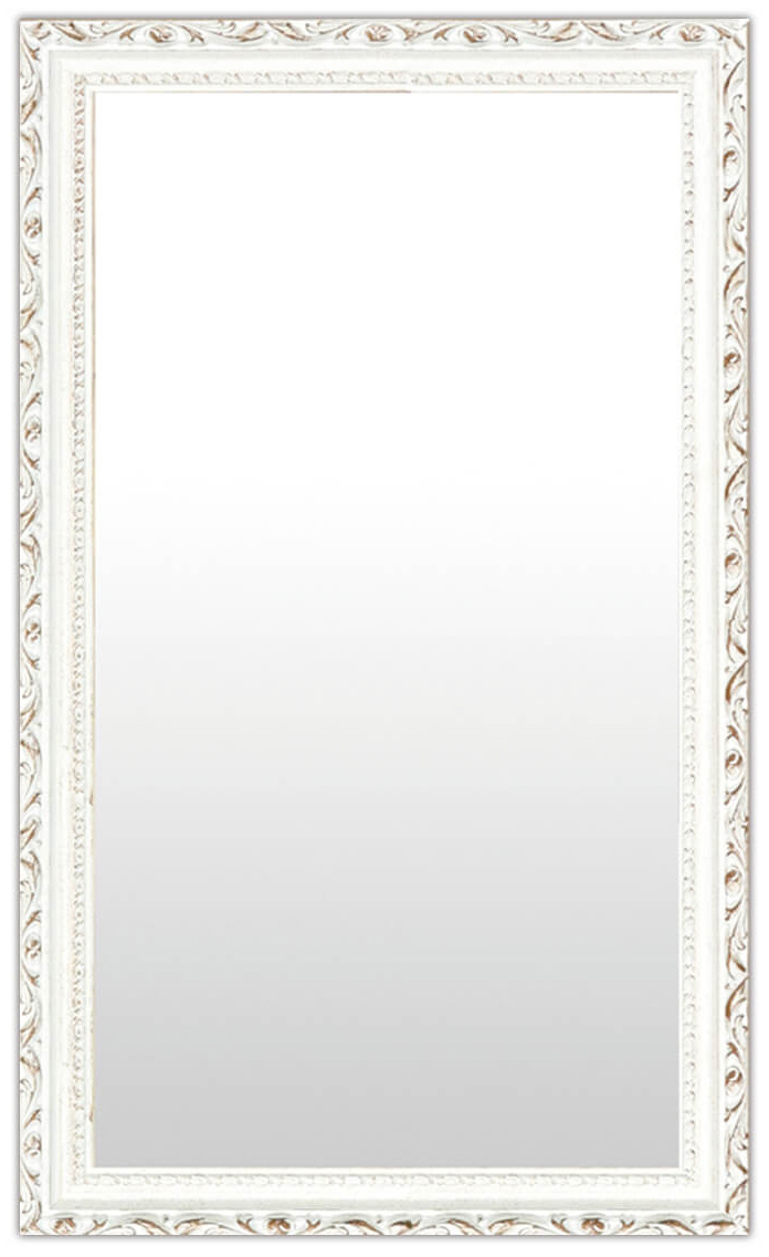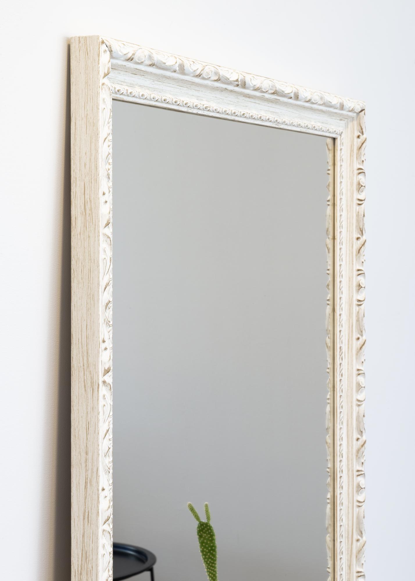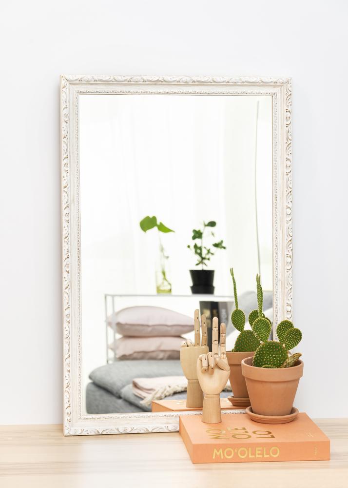 Biele zrkadlo v antickom štýle s viditeľnou textúrou dreva a šírkou 40 mm. Výborná voľba, keď hľadáte zrkadlo, ktoré vynikne a zaujme priestor.