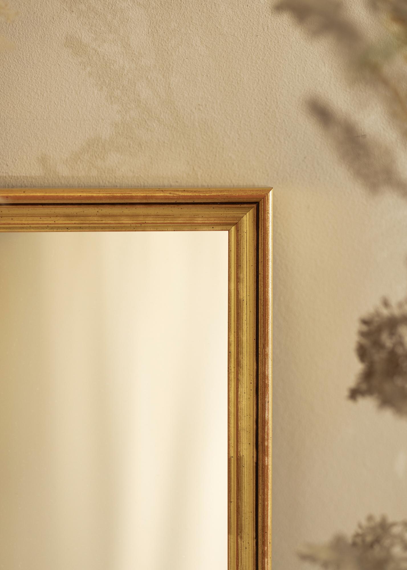 Toto zrkadlo má hĺbku 39 mm, čo mu dodáva robustný pocit bez toho, aby bolo príliš ťažké alebo dominantné. Vyrobené z borovice, kombinuje trvanlivosť s ľahkosťou, čo uľahčuje jeho montáž na stenu. Zlatý povrch má ľahkú antikovanú úpravu s malými tmavými detailmi, čo vytvára nadčasový charakter, ktorý sa hodí k moderným aj klasickým dizajnovým štýlom.