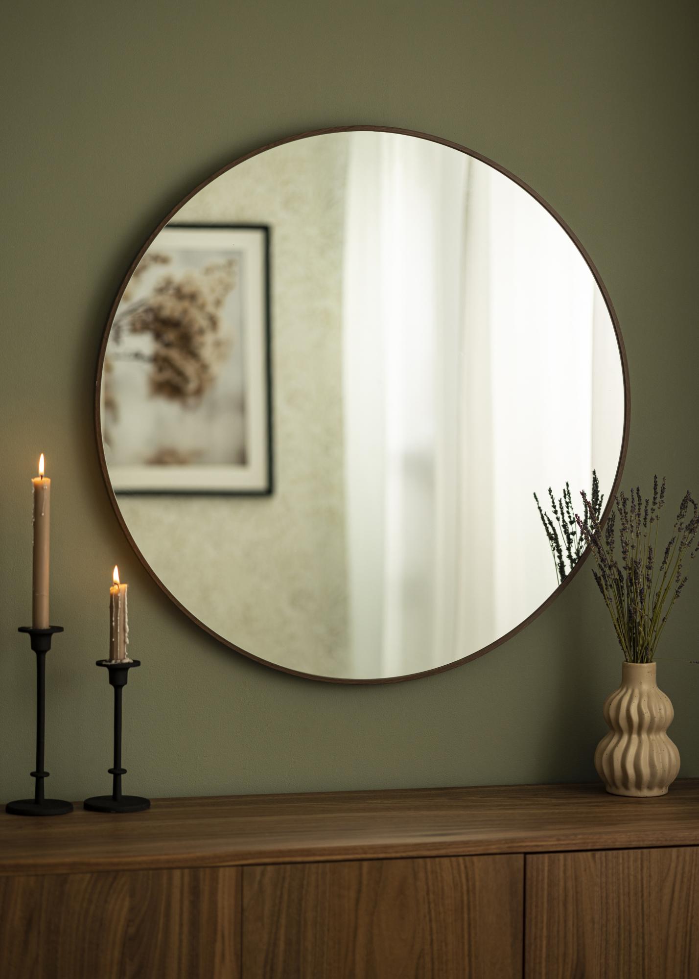Objavte elegantnú jednoduchú eleganciu s našim nástenným zrkadlom, ideálnym pre pridanie pocitu priestoru a svetla vo vašom dome. S pôsobivým priemerom 80 cm sa toto zrkadlo stane okamžitým centrom pozornosti v každej miestnosti. Jeho okrúhly tvar dodáva jemný a prívetivý pocit, zatiaľ čo rám z orechovo sfarbeného hliníka dodáva dotyk sofistikovanosti.