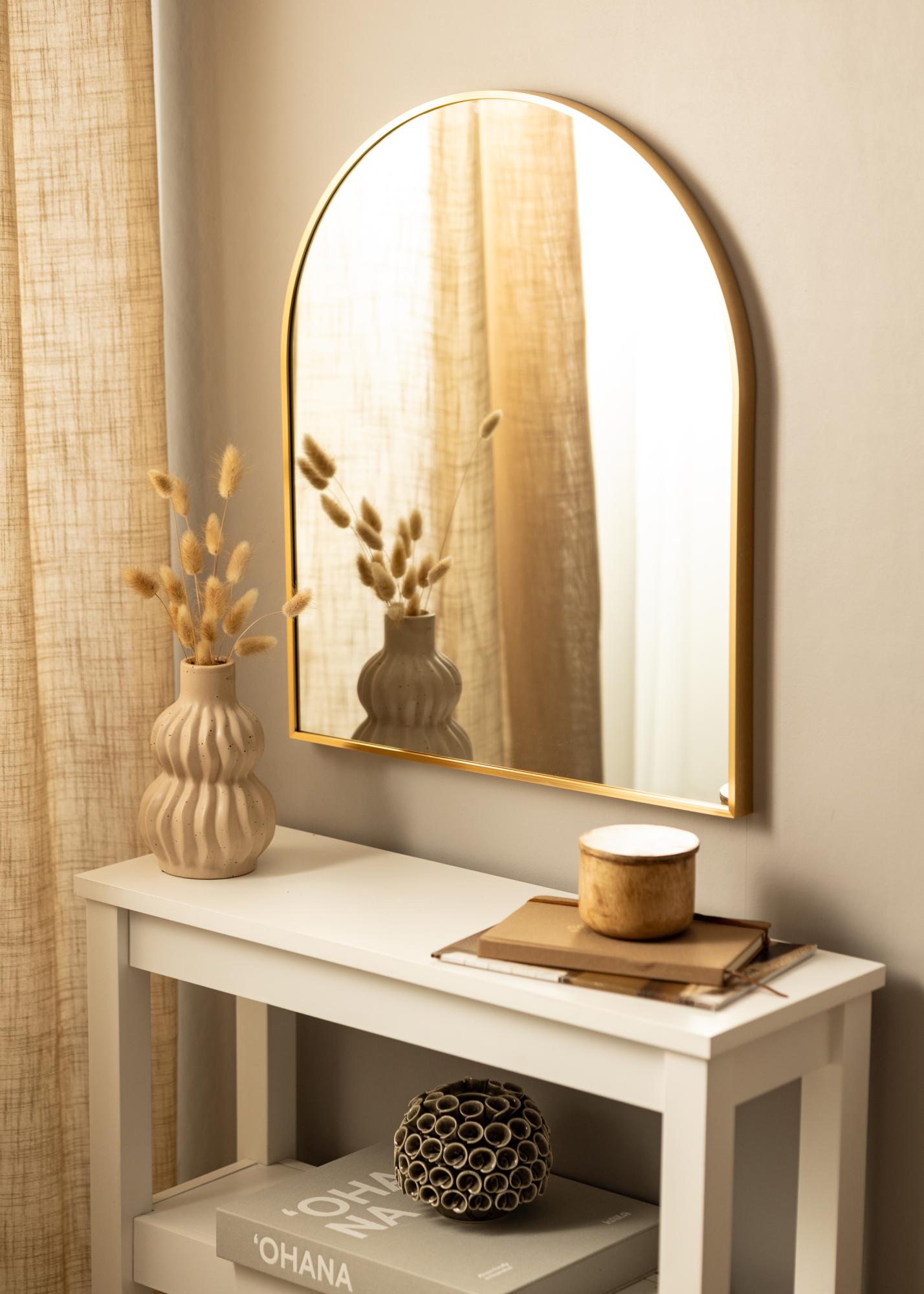 Toto je moderné nástenné zrkadlo, ktoré možno použiť v každej miestnosti. Môžete ho nechať ako trendový detail v spálni alebo obývacej izbe, alebo ho použiť ako kúpeľňové zrkadlo či predsieňové zrkadlo, aby ste sa mohli poriadne upraviť, keď sa pripravujete na deň. Zrkadlo má rám z kovu s hĺbkou 28 mm, s exkluzívnym zlatým odtieňom, ktorý mu dodáva dokonalú eleganciu. Elegantný tvar inšpirovaný veľrybou ešte viac posilňuje luxusný výraz.