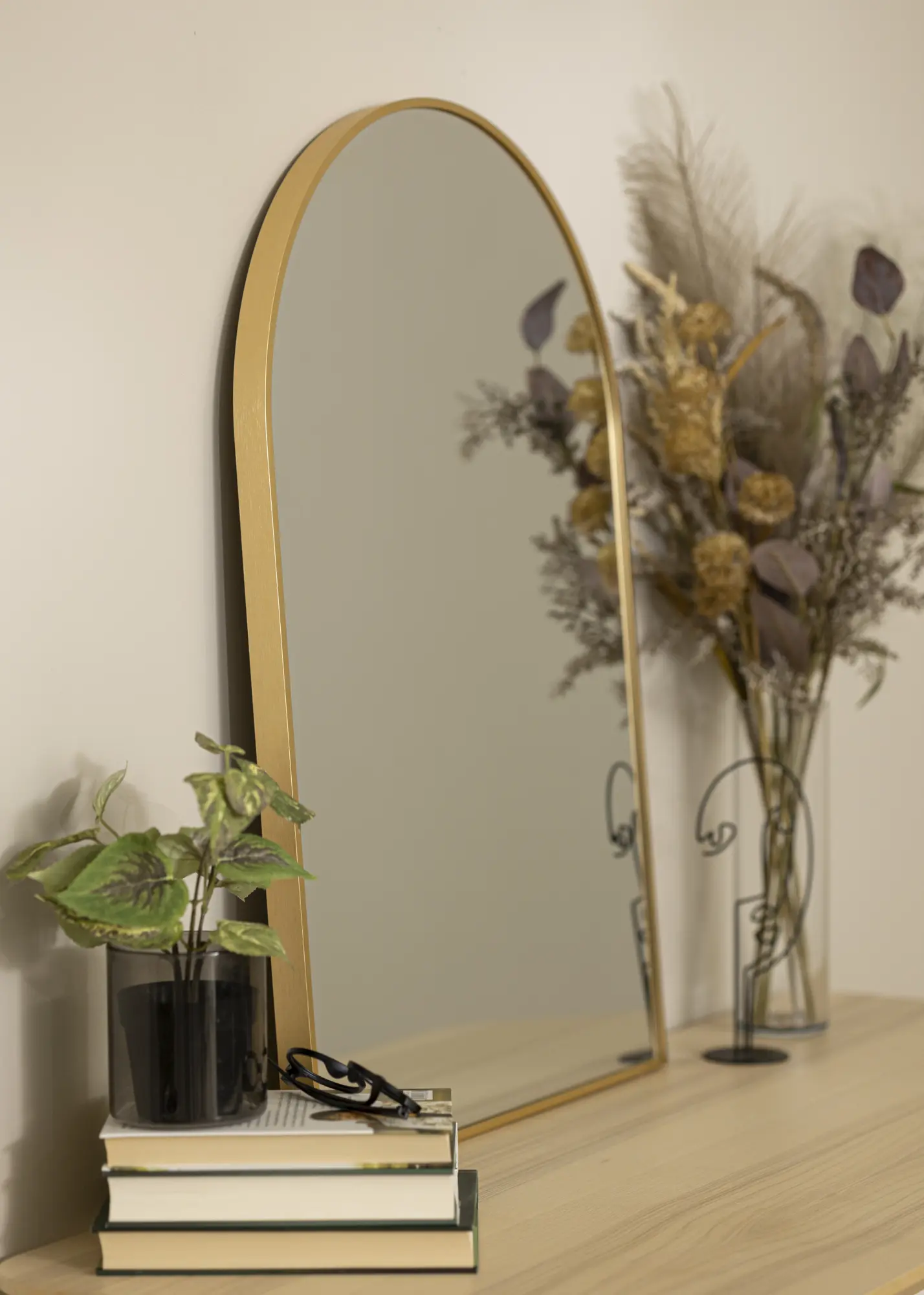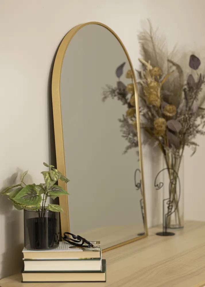 Toto je moderné nástenné zrkadlo, ktoré možno použiť v každej miestnosti. Môžete ho buď nechať ako trendový detail v spálni alebo obývacej izbe, alebo ho použiť ako kúpeľňové alebo predsieňové zrkadlo, aby ste sa mohli riadne pozrieť, keď sa chystáte na deň. Zrkadlo má 28 mm hlboký rám z kovu, s exkluzívnym zlatým odtieňom, ktorý mu dodáva výnimočný šmrnc. Štýlový tvar inšpirovaný valom ešte viac posilňuje luxusný výraz.