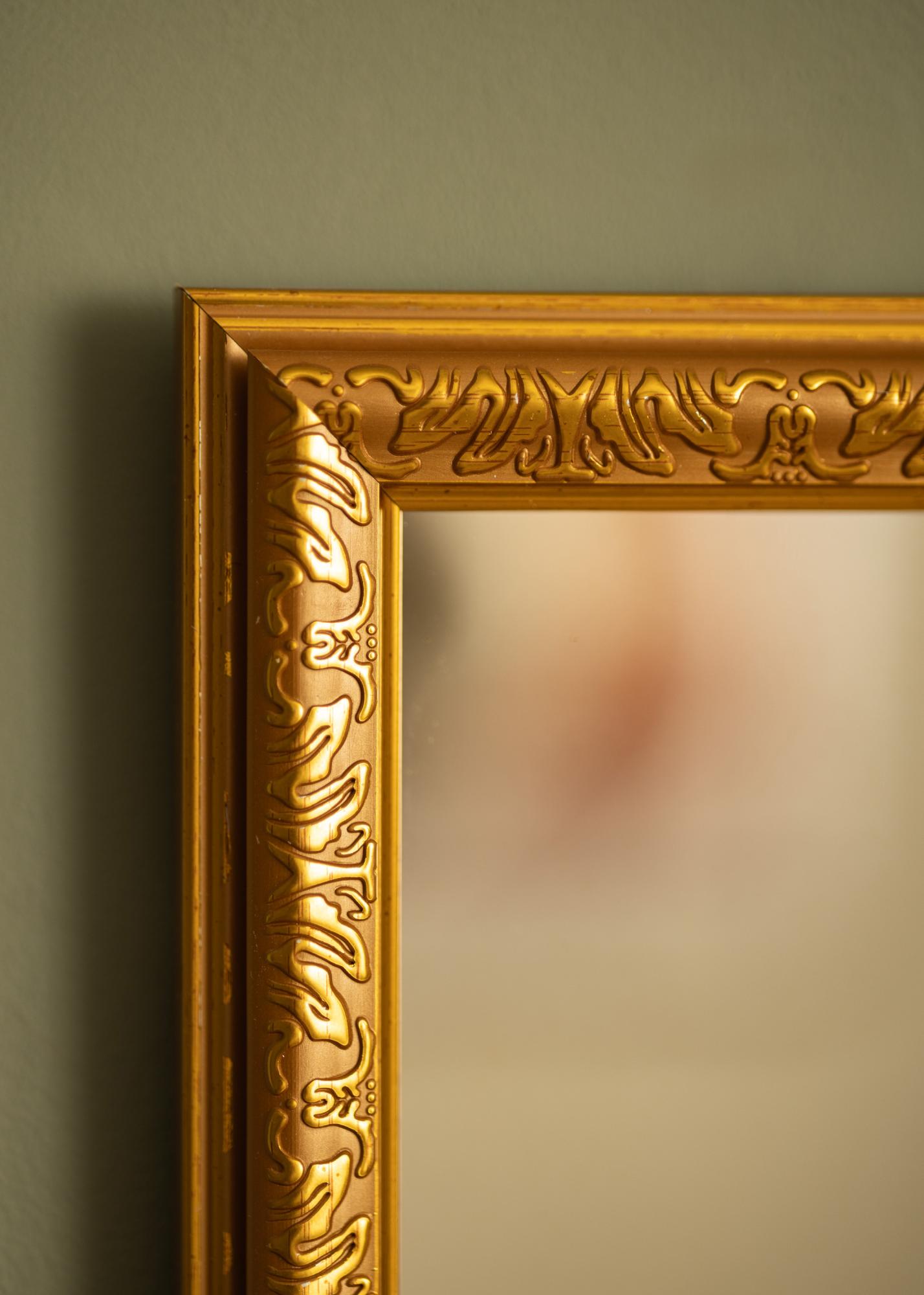 Ak hľadáte luxusné zrkadlo so zlatou farbou, môžete prestať hľadať. Nostalgia Zlato je nástenné zrkadlo s 2,8 cm širokým rámom s elegantným profilom a krásnym dekoratívnym vzorom. Zrkadlové sklo bude odrážať svetlo vo vašej izbe, zatiaľ čo samotné zrkadlo bude štýlovým detailom na vašej stene. Na zadnej strane sú úchyty na stenu pre jednoduchšie zavesenie.