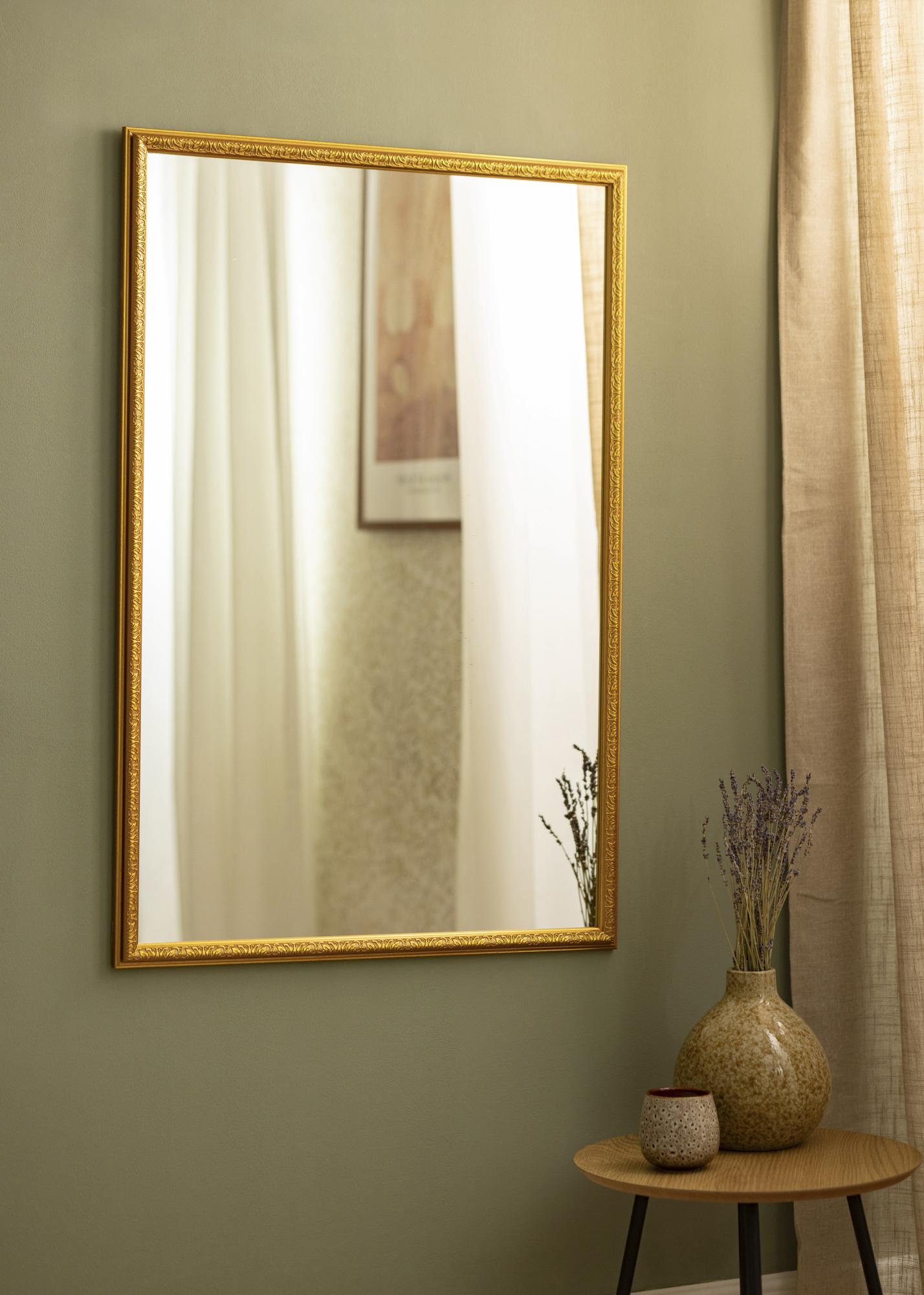 Ak hľadáte luxusné zrkadlo v zlatej farbe, môžete prestať hľadať. Nostalgia Zlato je nástenné zrkadlo s rámom širokým 2,8 cm s elegantným profilom a krásnym dekoratívnym vzorom. Zrkadlové sklo bude odrážať svetlo vo vašej miestnosti, zatiaľ čo samotné zrkadlo sa stane štýlovým detailom na vašej stene. Na zadnej strane sa nachádza nástenný držiak pre jednoduchšie zavesenie.