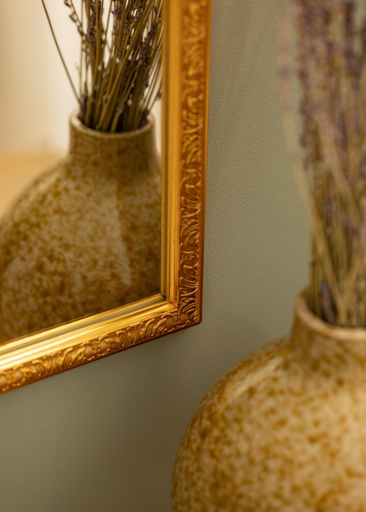 Hľadáte luxusné zrkadlo v zlatej farbe? Už nemusíte hľadať ďalej. Nostalgia Gold je nástenné zrkadlo s rámom širokým 2,8 cm s elegantným profilom a krásnym dekoratívnym vzorom. Zrkadlové sklo bude odrážať svetlo vo vašej izbe, zatiaľ čo samotné zrkadlo sa stane štýlovým prvkom na tvojej stene. Na zadnej strane je nástenný držiak pre jednoduchšie zavesenie.