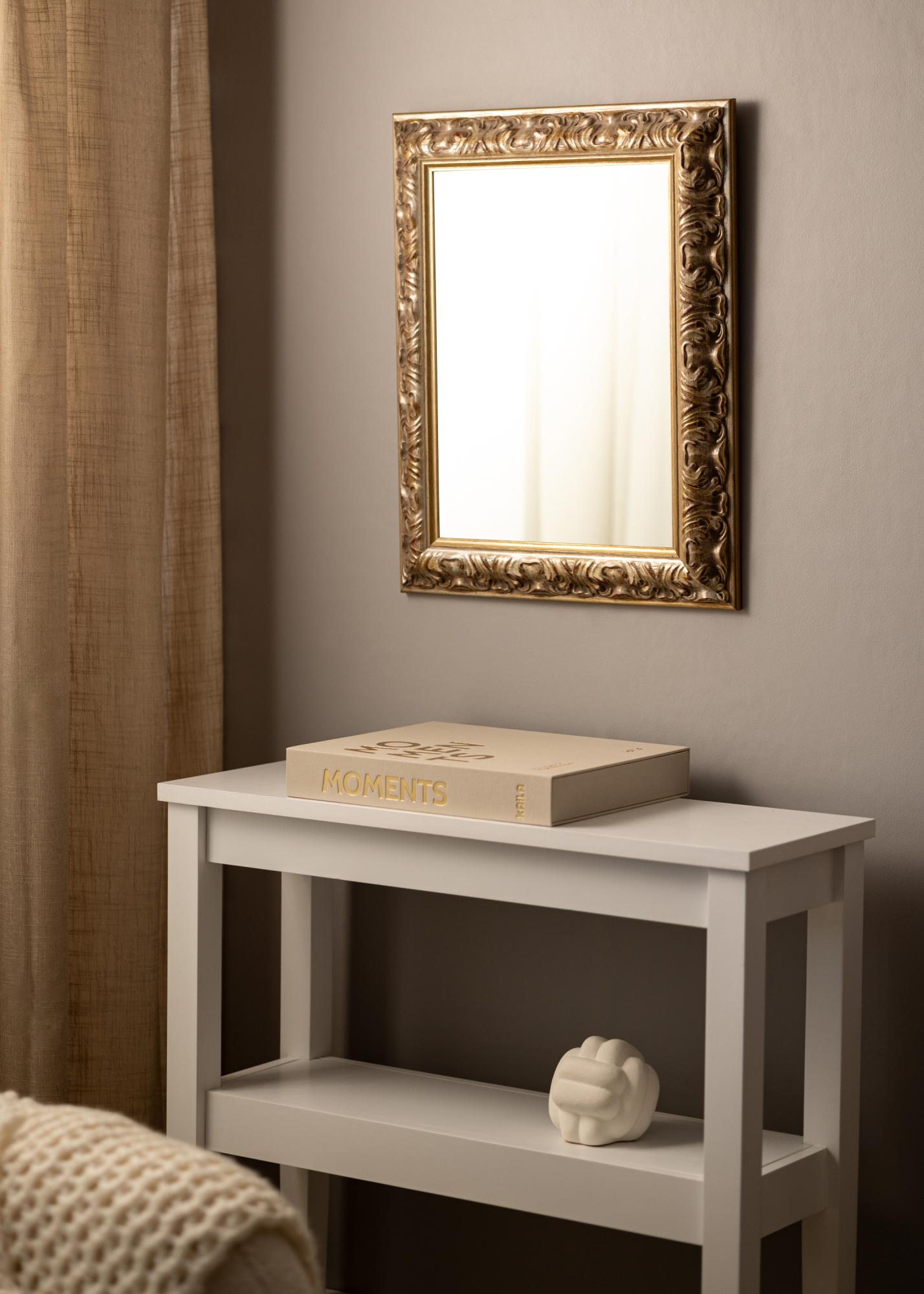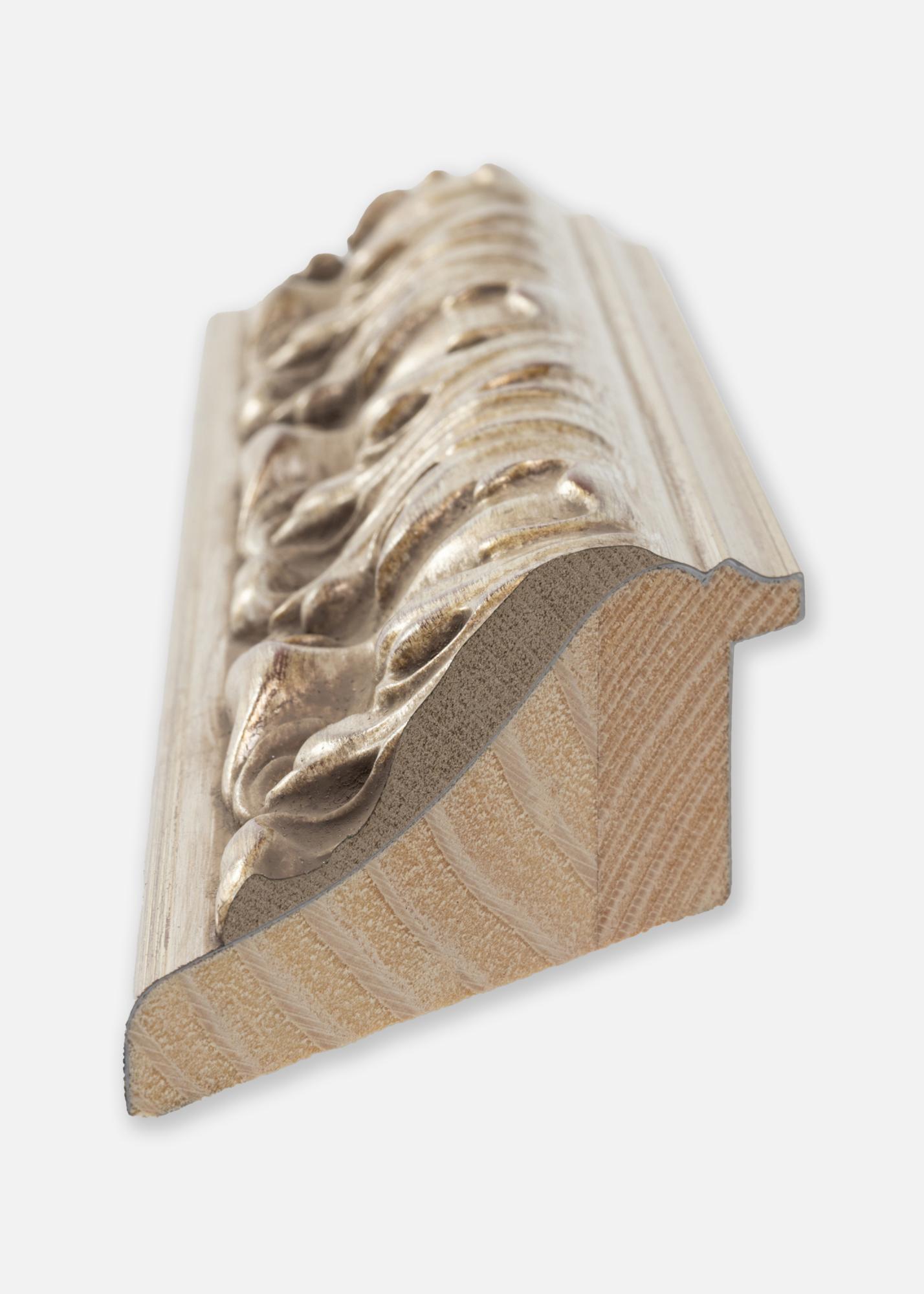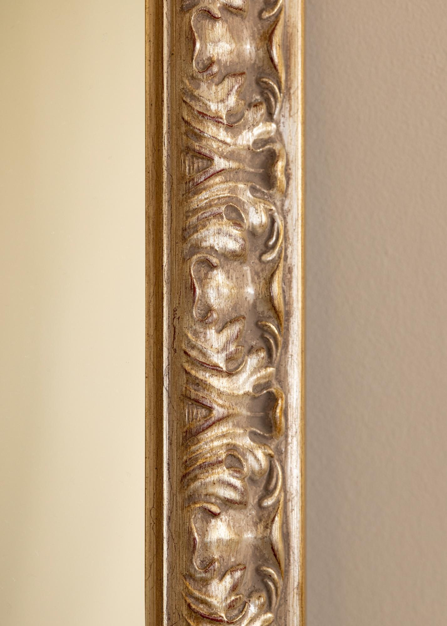 Rám je vyrobený z borovice a má antickú striebornú povrchovú úpravu s jemnými zlatými detailmi a červenými prvky. Táto farebná kombinácia vytvára krásny kontrast a dodáva zrkadlu klasický a sofistikovaný výraz. Dekoratívny vzhľad znamená, že zrkadlo je ideálne na rámovanie tam, kde sa sleduje elegantný pocit.