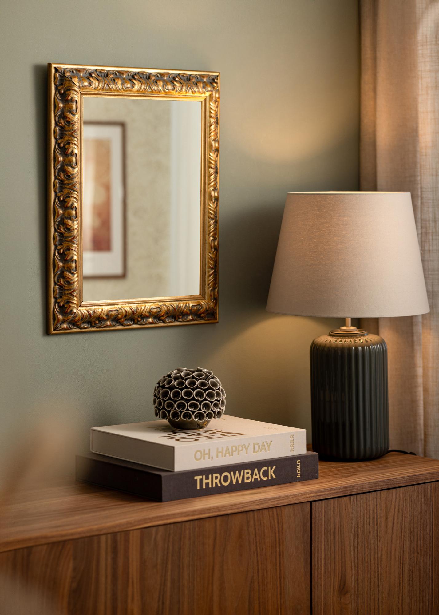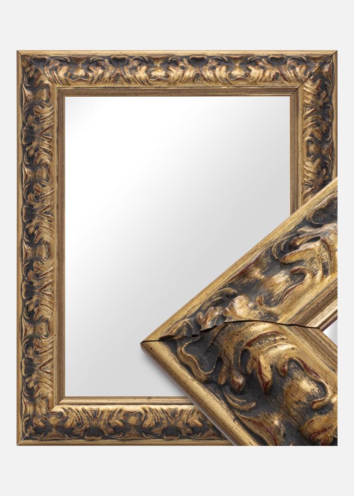 Zrkadlo Odin Zlatá/Červená je elegantné a štýlové zrkadlo, ktoré sa vyrába podľa vašich vlastných rozmerov. So svojím ozdobeným zlatým rámom a antickou patinou sa stane nápadným prvkom v akejkoľvek miestnosti. Rám, ktorý je 64 mm široký a má hĺbku 38,5 mm, je vyrobený z borovice a je zdobený detailmi v barokovom štýle. Reliéfne vzorované rezby dodávajú zrkadlu unikátny charakter a zdôrazňujú ho jemným kontrastom medzi zlatom a tmavými odtieňmi.
