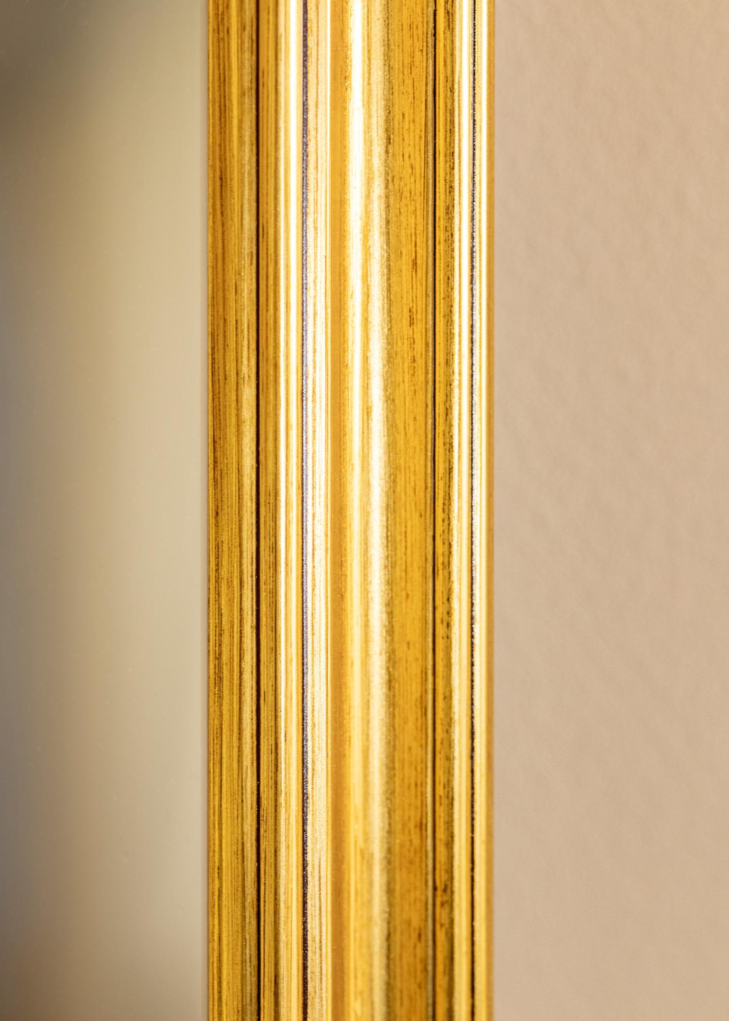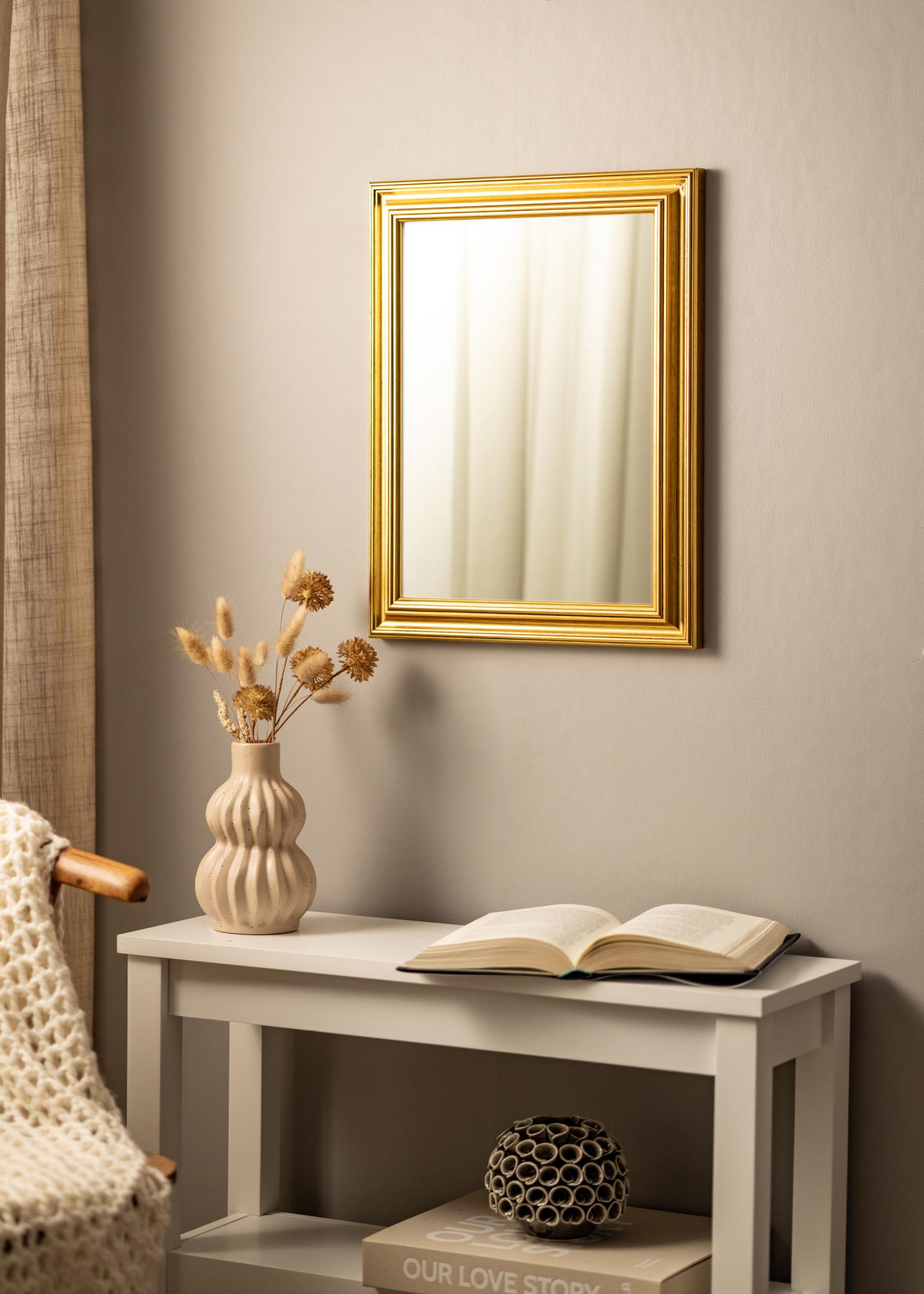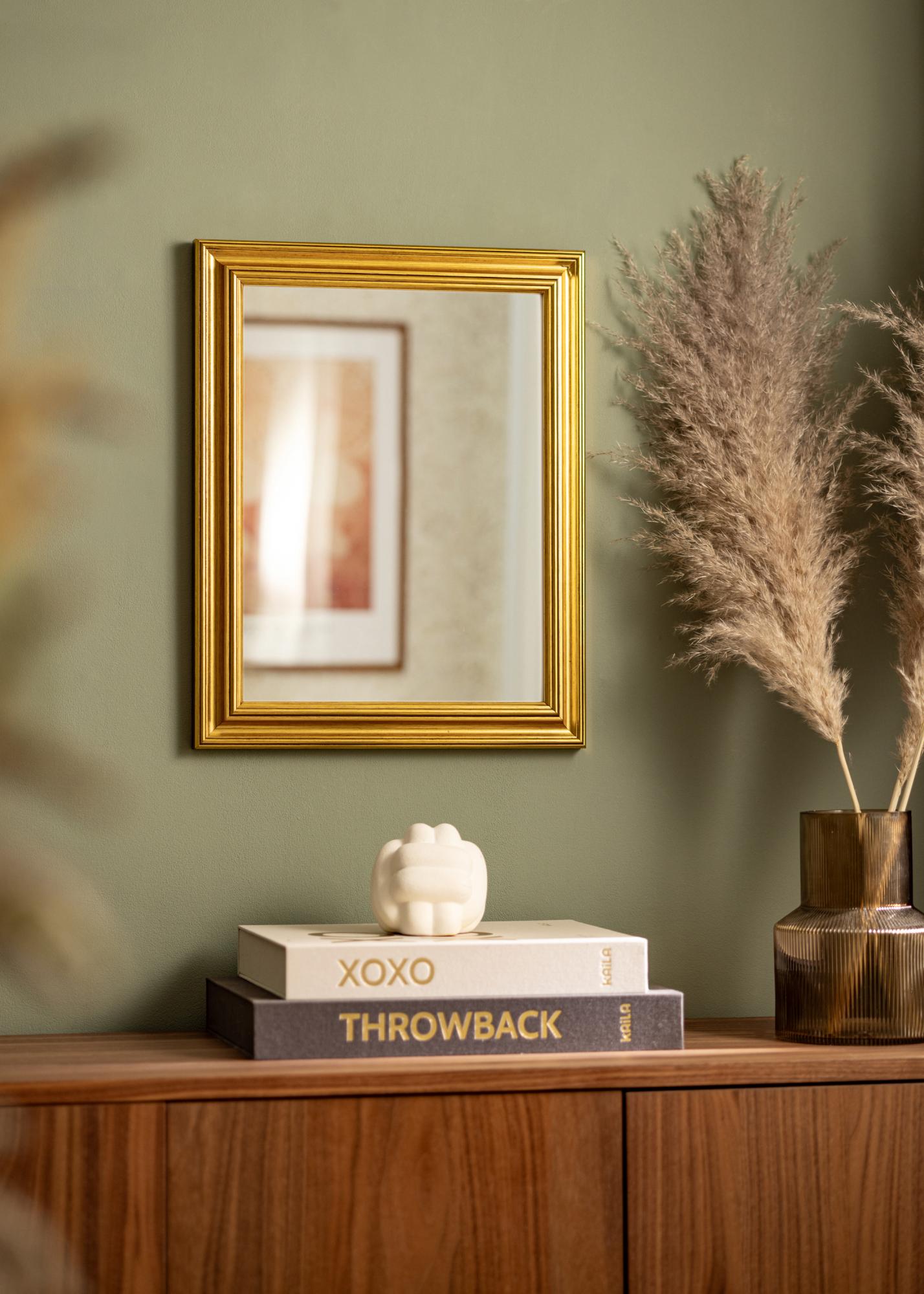 Klasicky profilované zrkadlo so zlatým rámom z dreva, ktoré pôsobí ručne maľované, čo dáva zrkadlu živý vzhľad a pekný lesk. Široká rámová lišta dodáva zrkadlu exkluzívny vzhľad a zrkadlo sa tak hodí rovnako dobre do domova zariadeného so starožitnosťami, ako aj do moderného domova s romantickým alebo elegantným zariadením. Skombinujte zrkadlo s párom mosadzných svietnikov a obrazov v zlatých rámoch, aby ste vytvorili celkový dojem v miestnosti.