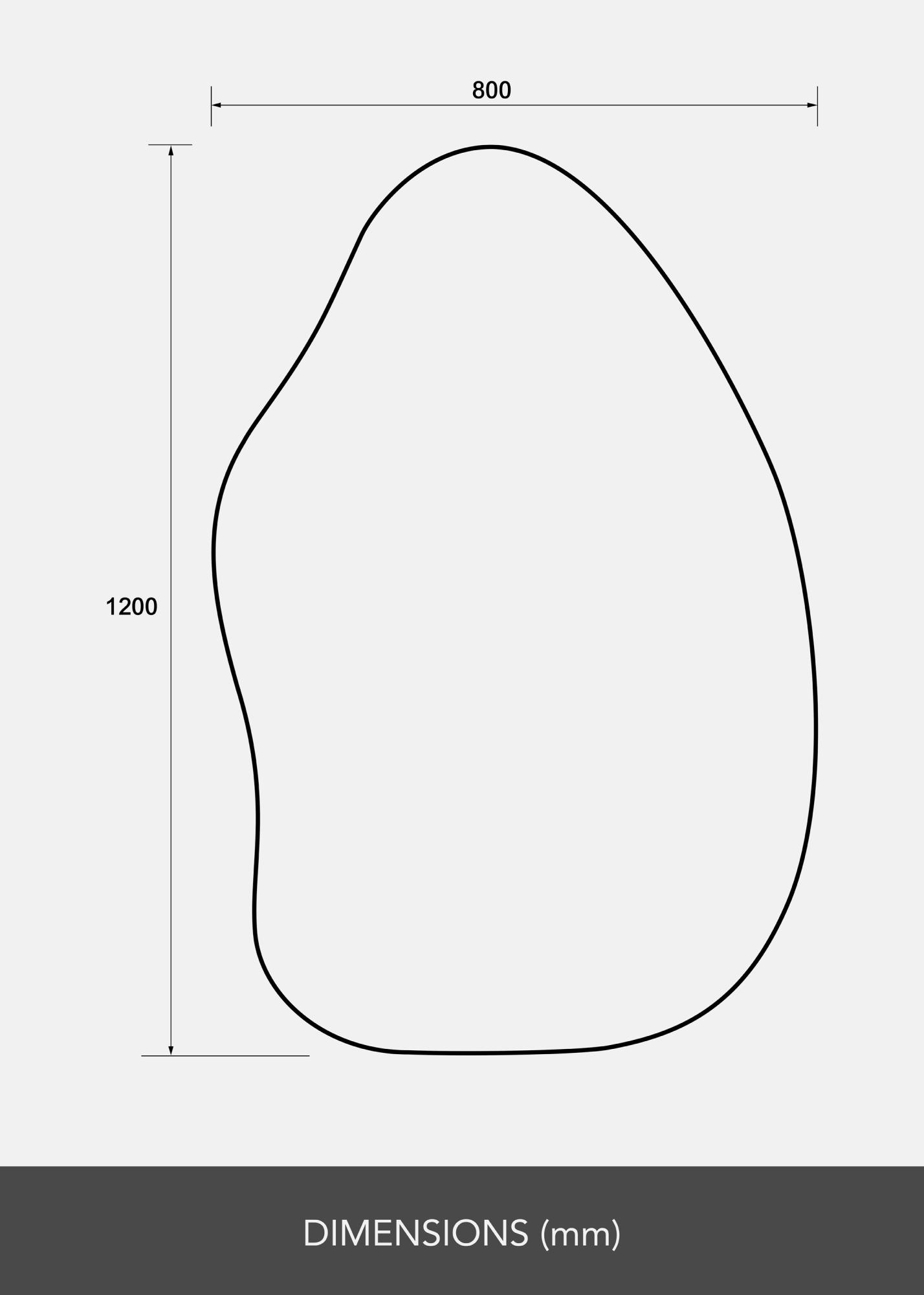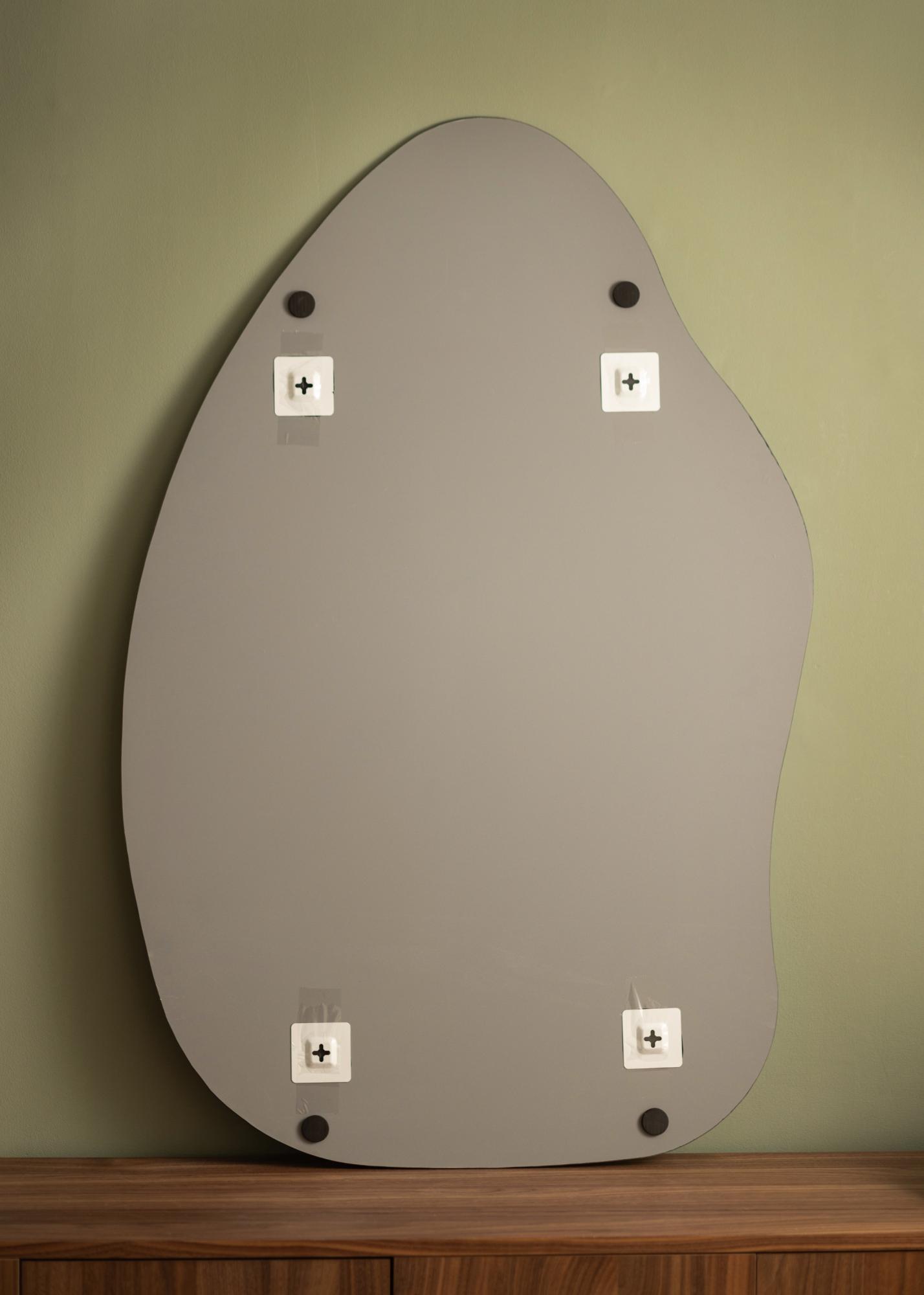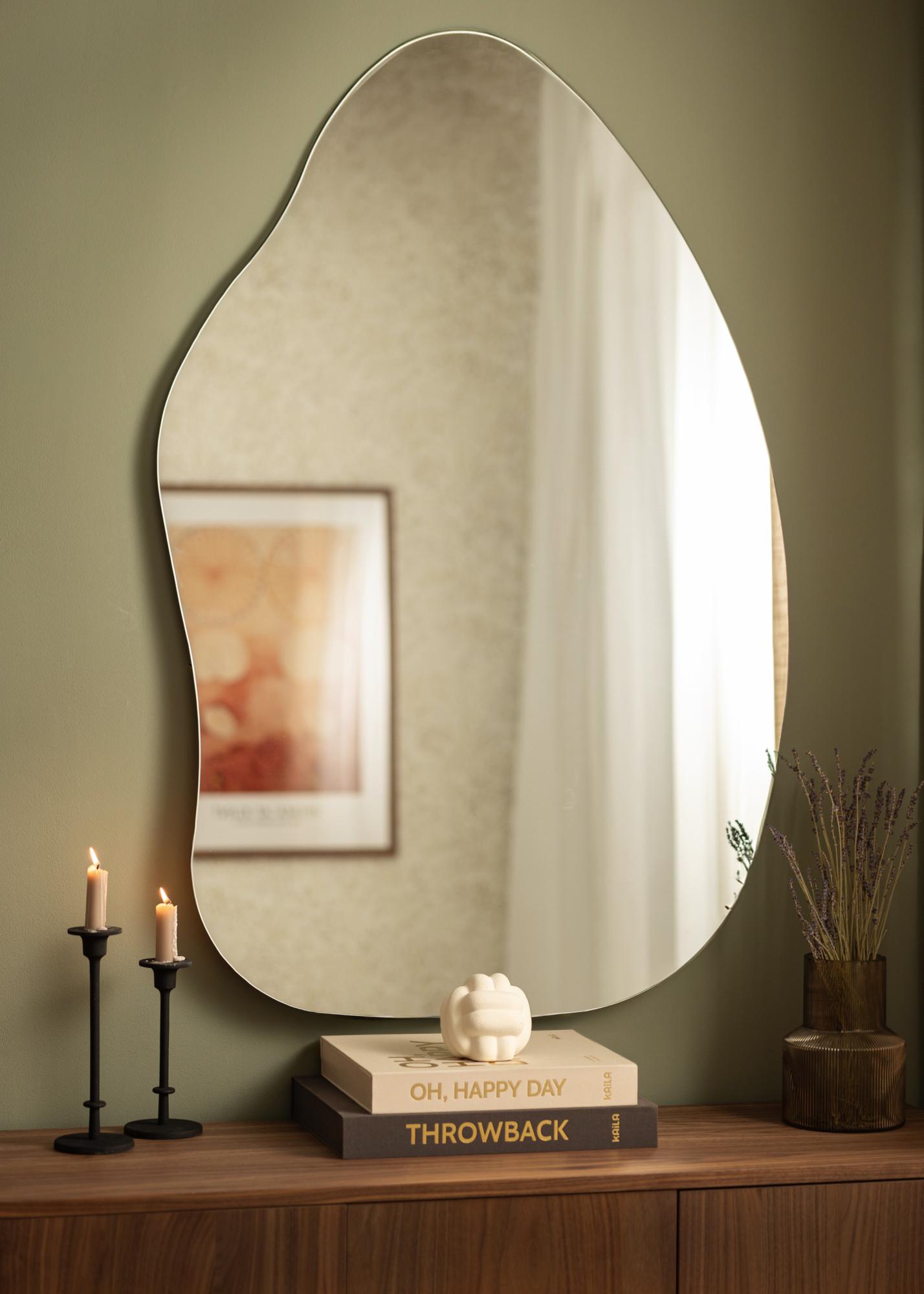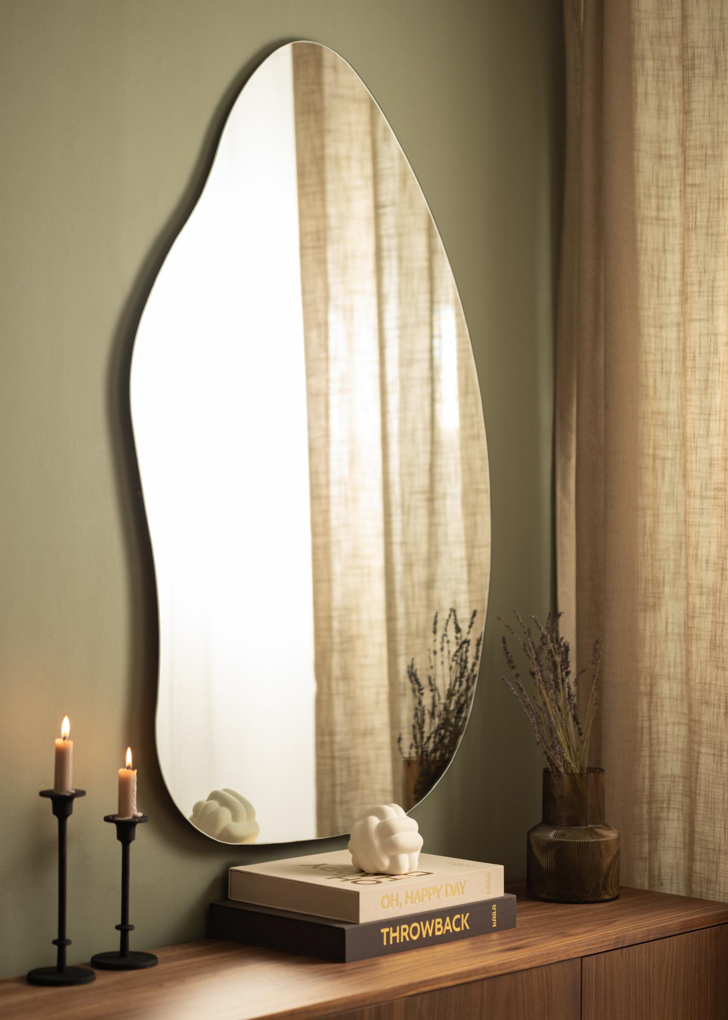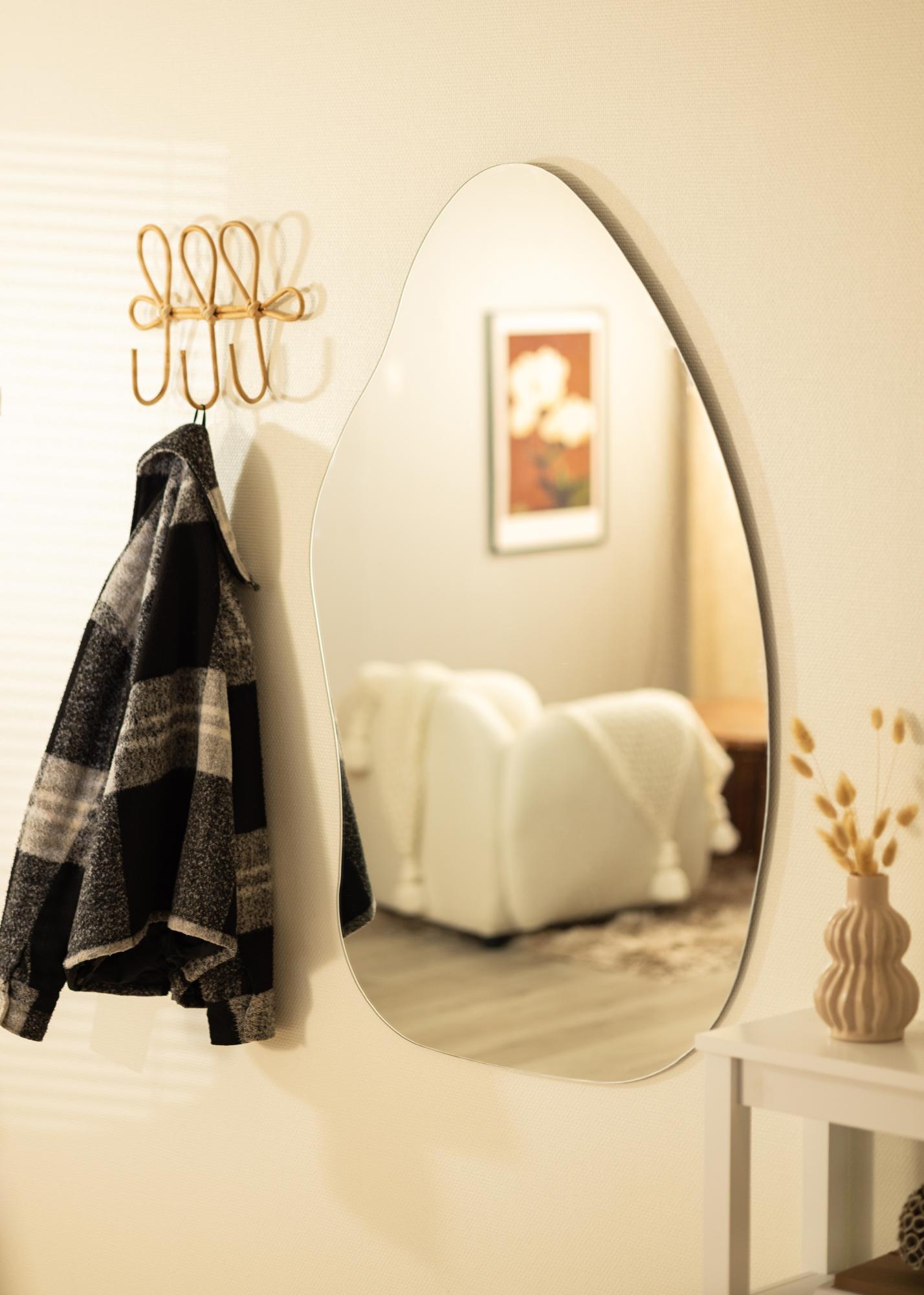Zrkadlo má mäkký a organický tvar pripomínajúci kvapku vody alebo stojaci list, čo pridáva eleganciu a moderný pocit miestnosti. Tento jedinečný tvar robí zrkadlo konverzačným začiatkom a umeleckým dielom samo o sebe, pričom zároveň plní svoju praktickú funkciu.