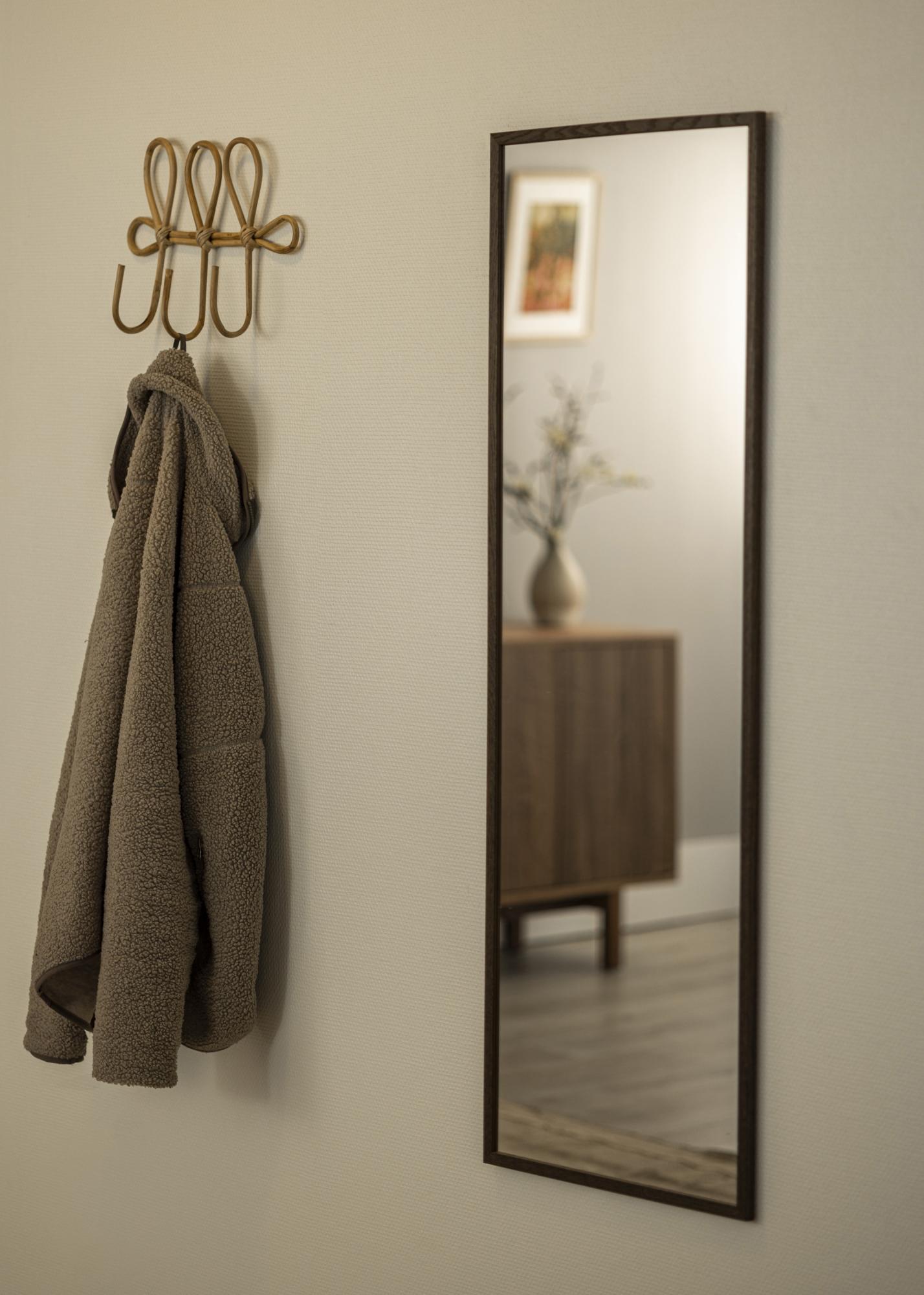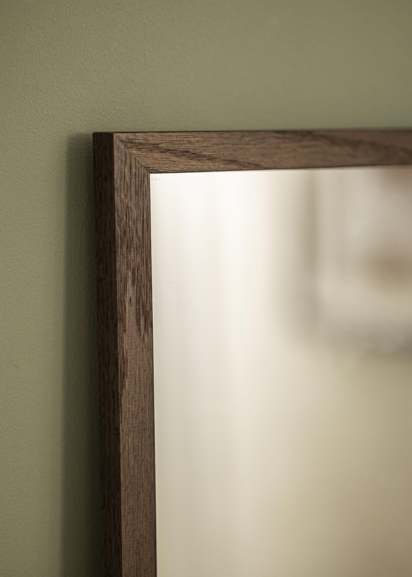 Rám zrkadla je vyrobený z pravého dubového dreva a má hlboký tmavý dubový odtieň, ktorý okamžite upúta pozornosť. Hrúbka rámu prispieva k pocitu robustnosti a dáva zrkadlu výraznú prítomnosť na stene. Toto zrkadlo nie je len praktickým doplnkom, ale aj umeleckým dielom, ktoré dopĺňa a zvyšuje vašu dekoráciu.