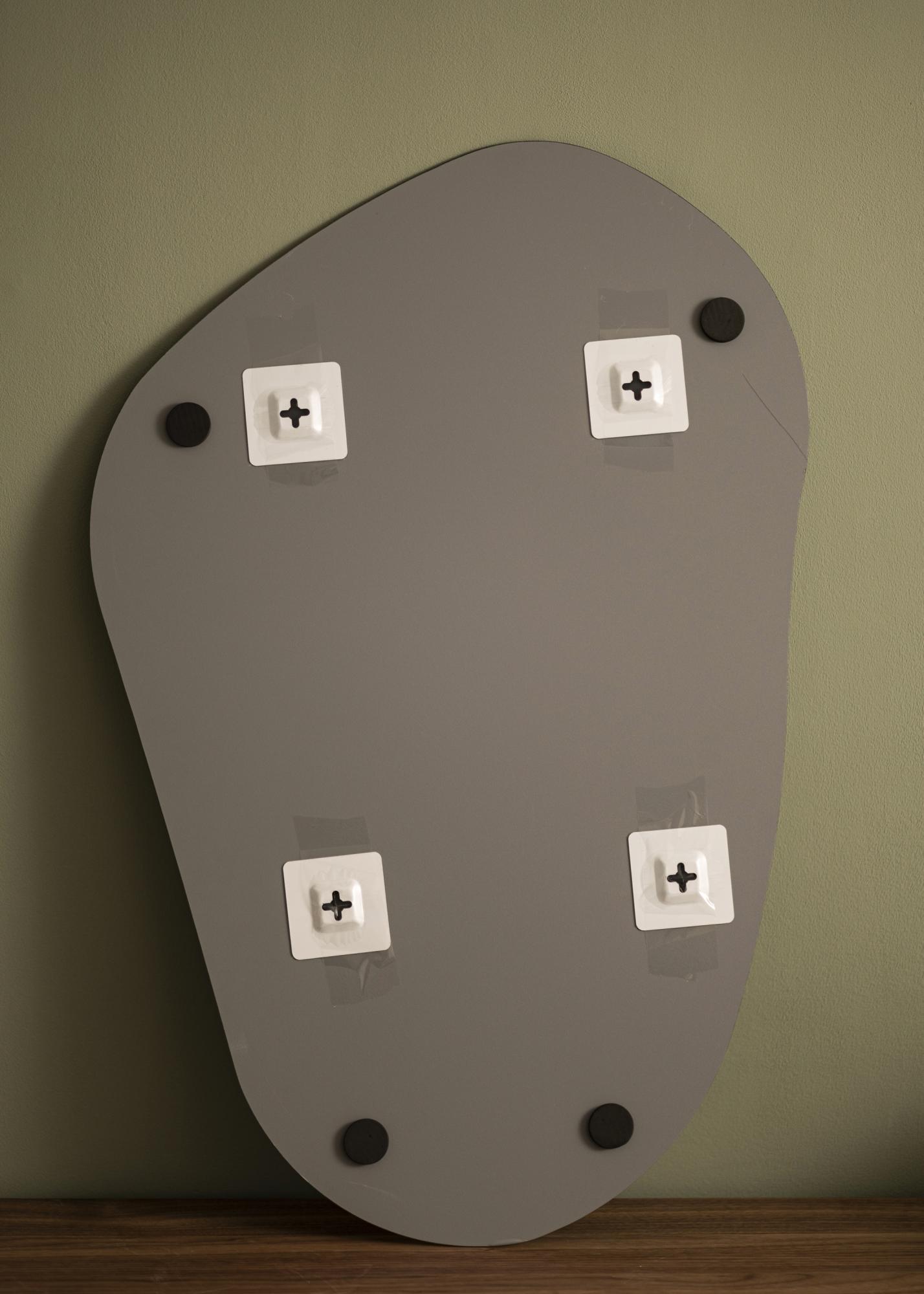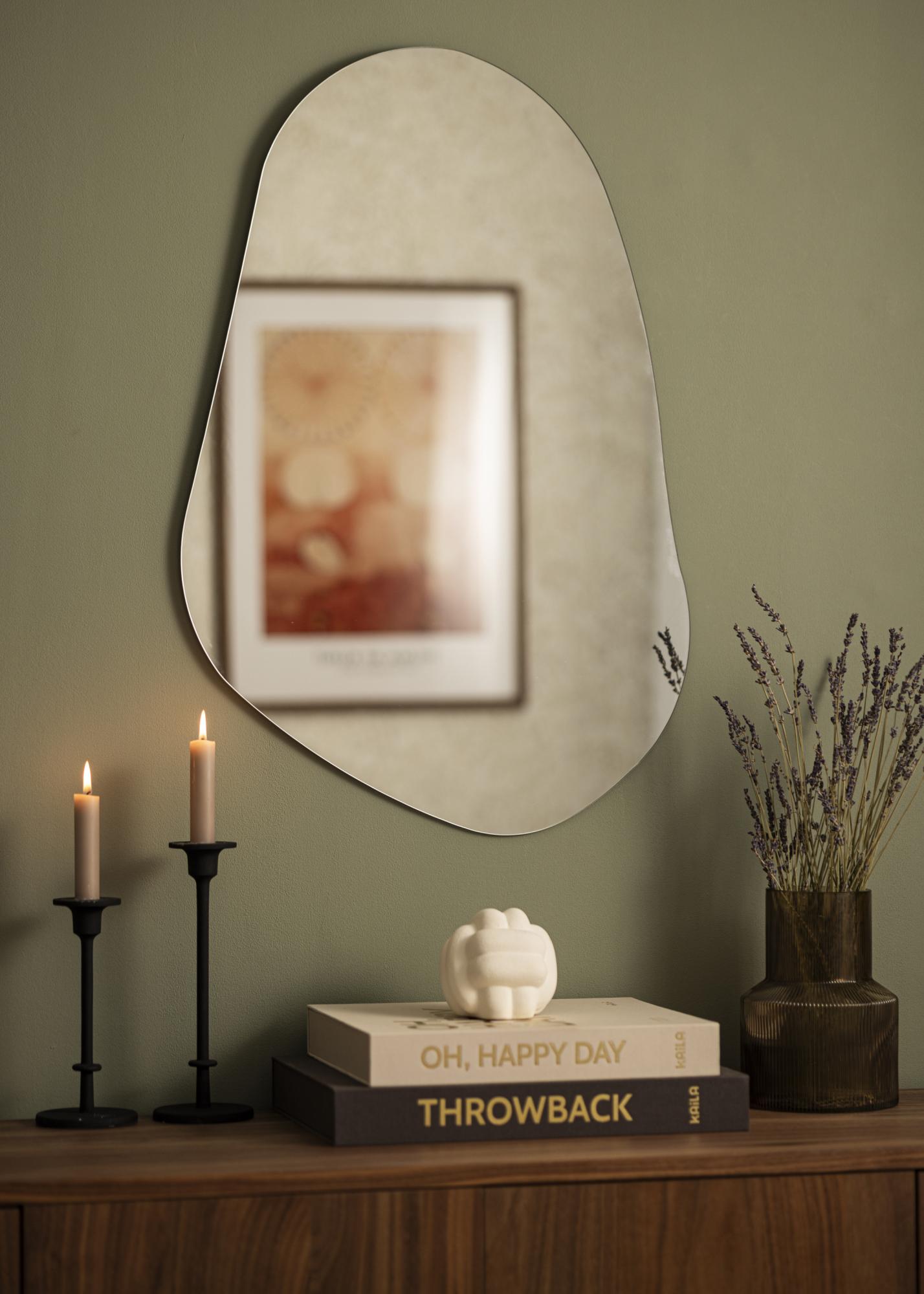 Toto Zrkadlo má organický, asymetrický a jemne zvlnený tvar, ktorý pôsobí moderne a umelecky. Jeho zaoblené krivky a absencia rovných hrán pripomínajú ručne kreslenú siluetu, podobnú prírodnému kameňu alebo predĺženému tvaru kvapky.