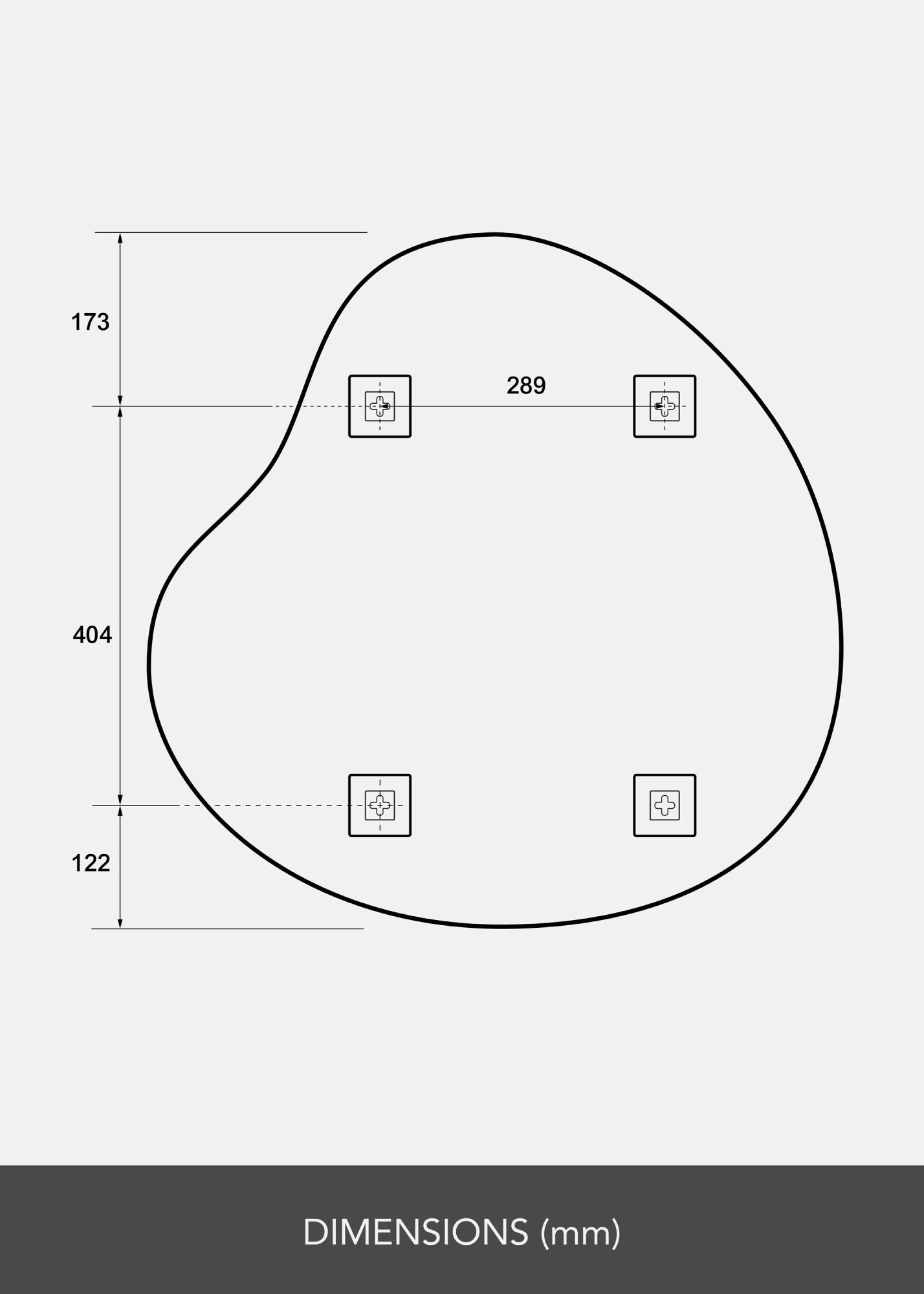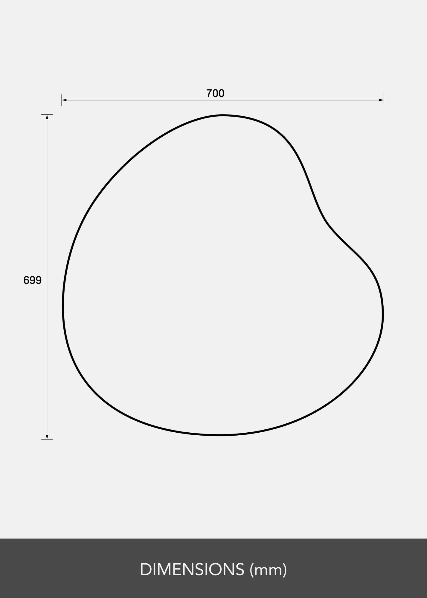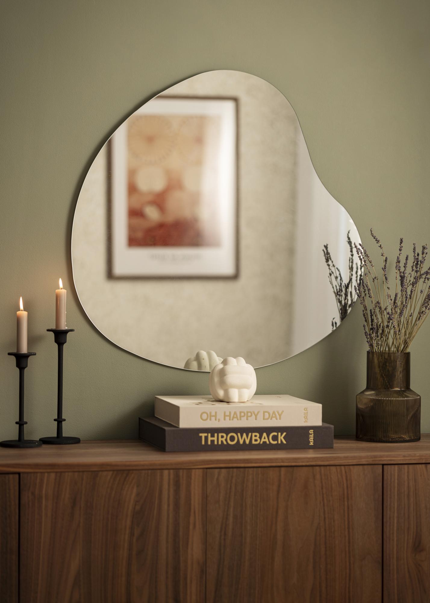 Zrkadlo má mäkko kontúrovaný, asymetrický tvar, ktorý sa ladne vlní a dodáva dojem pohybu a jemnosti. Tento dizajn robí zrkadlo umeleckým detailom na stene, pričom si zachováva svoju praktickú funkciu.