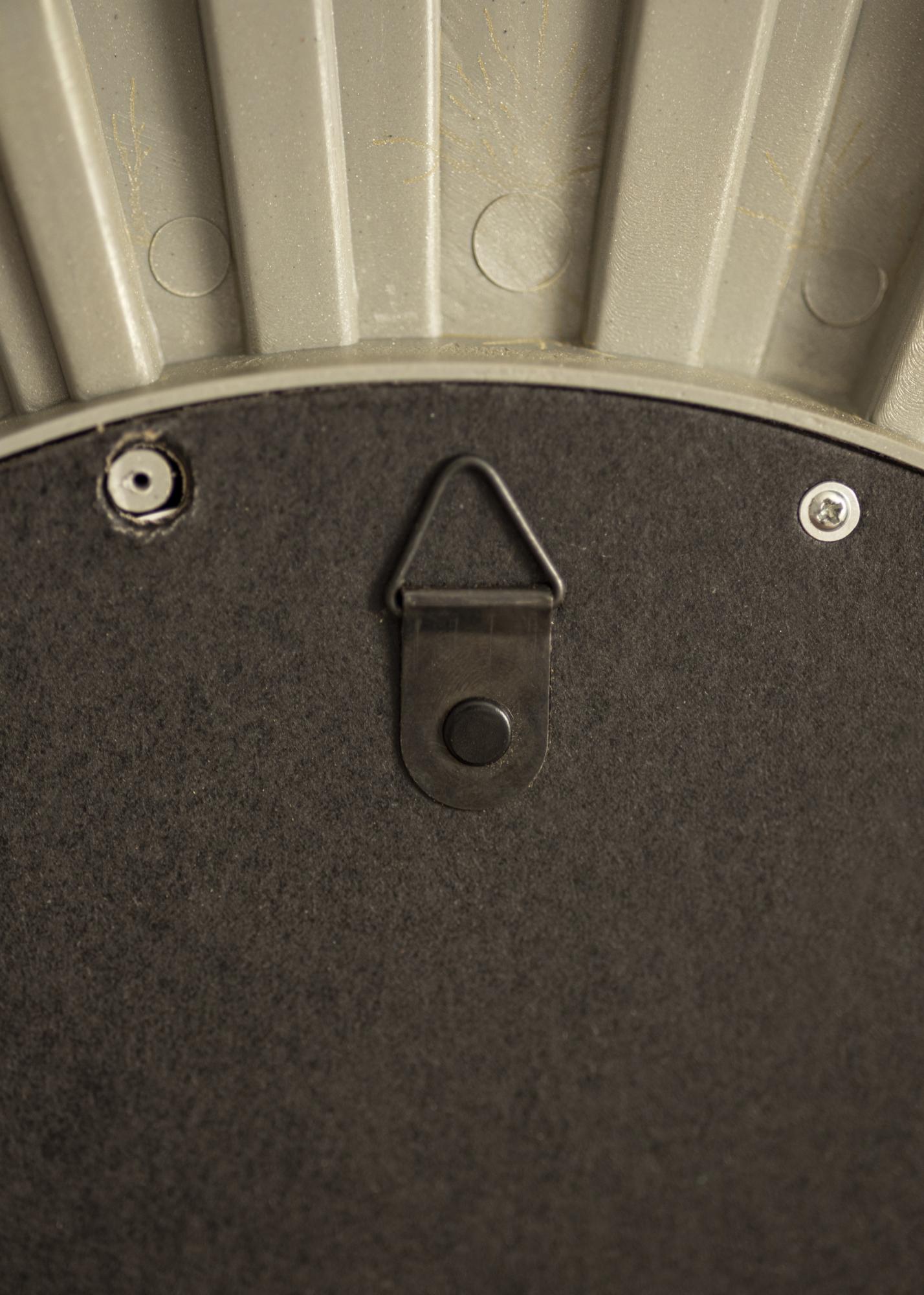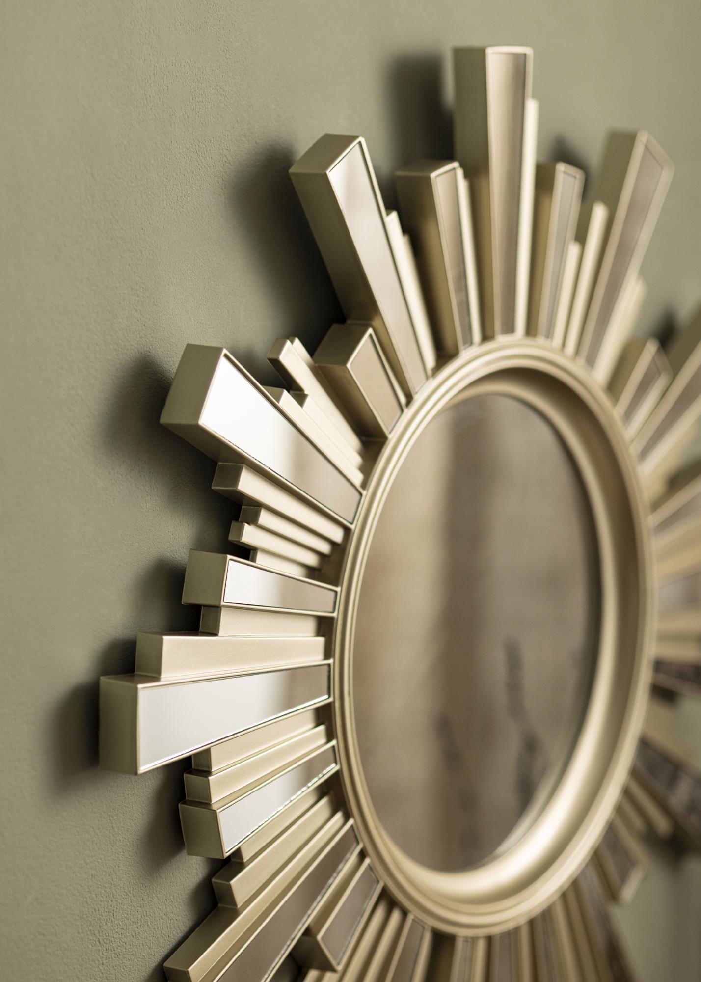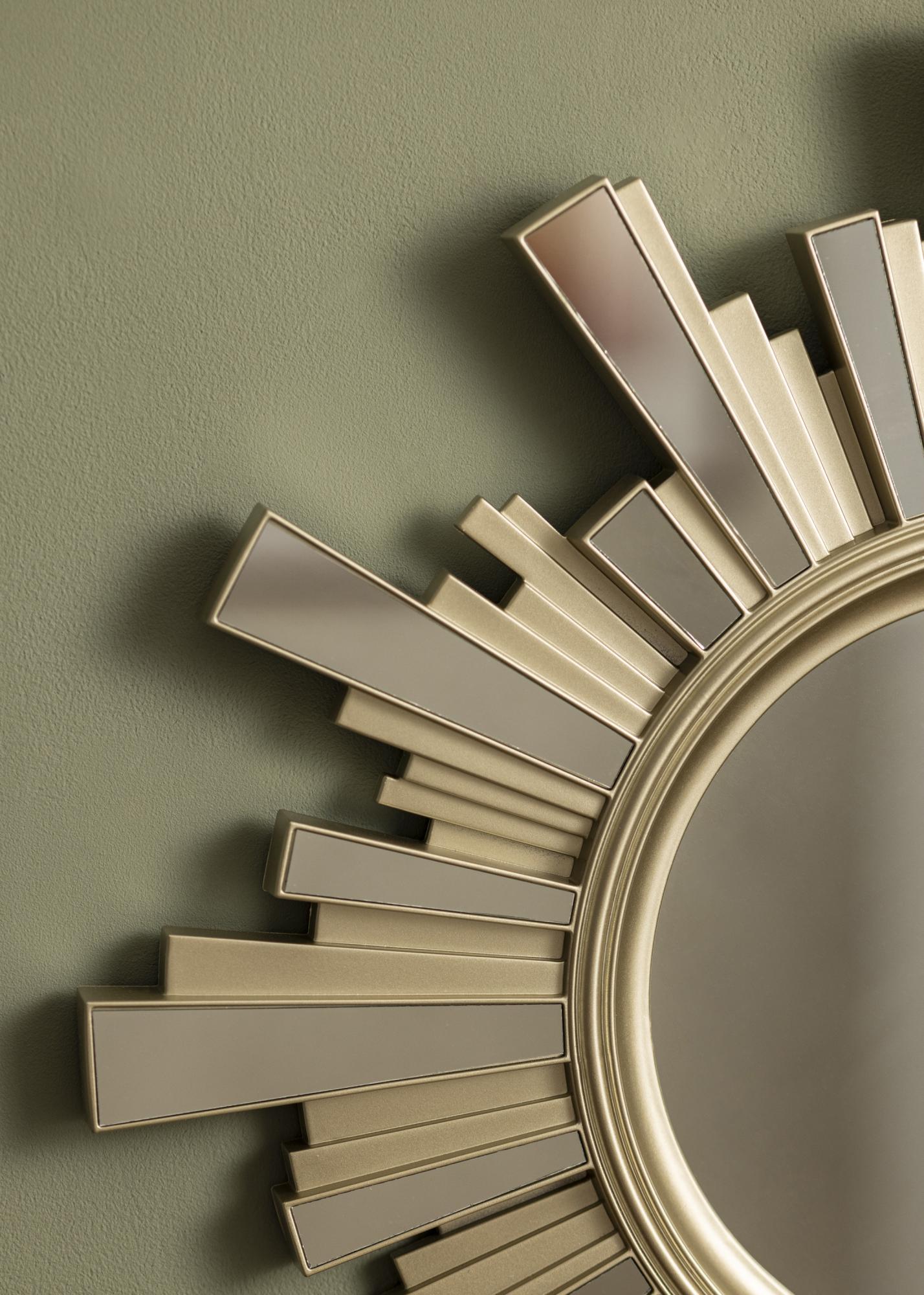 Toto okrúhle zrkadlo má veľmi dekoratívny rám v tvare slnka. Rám je zlatej farby, čo zrkadlu dodáva elegantný a čistý vzhľad.