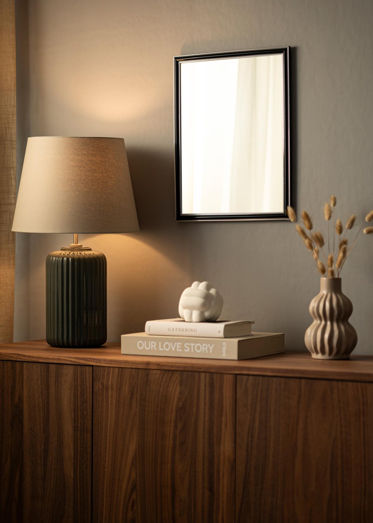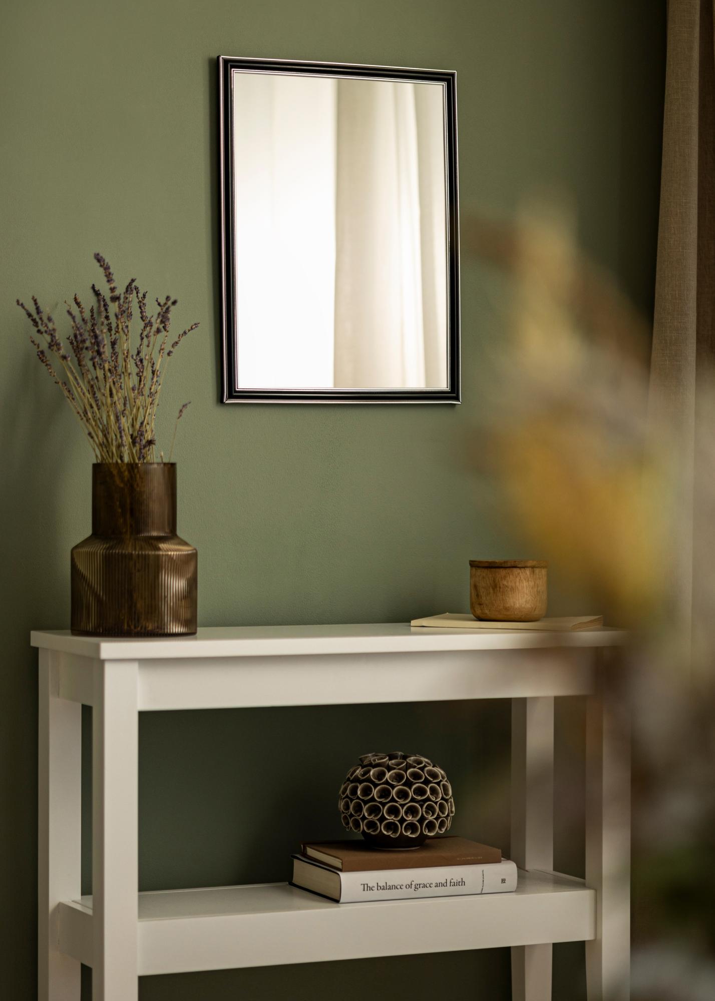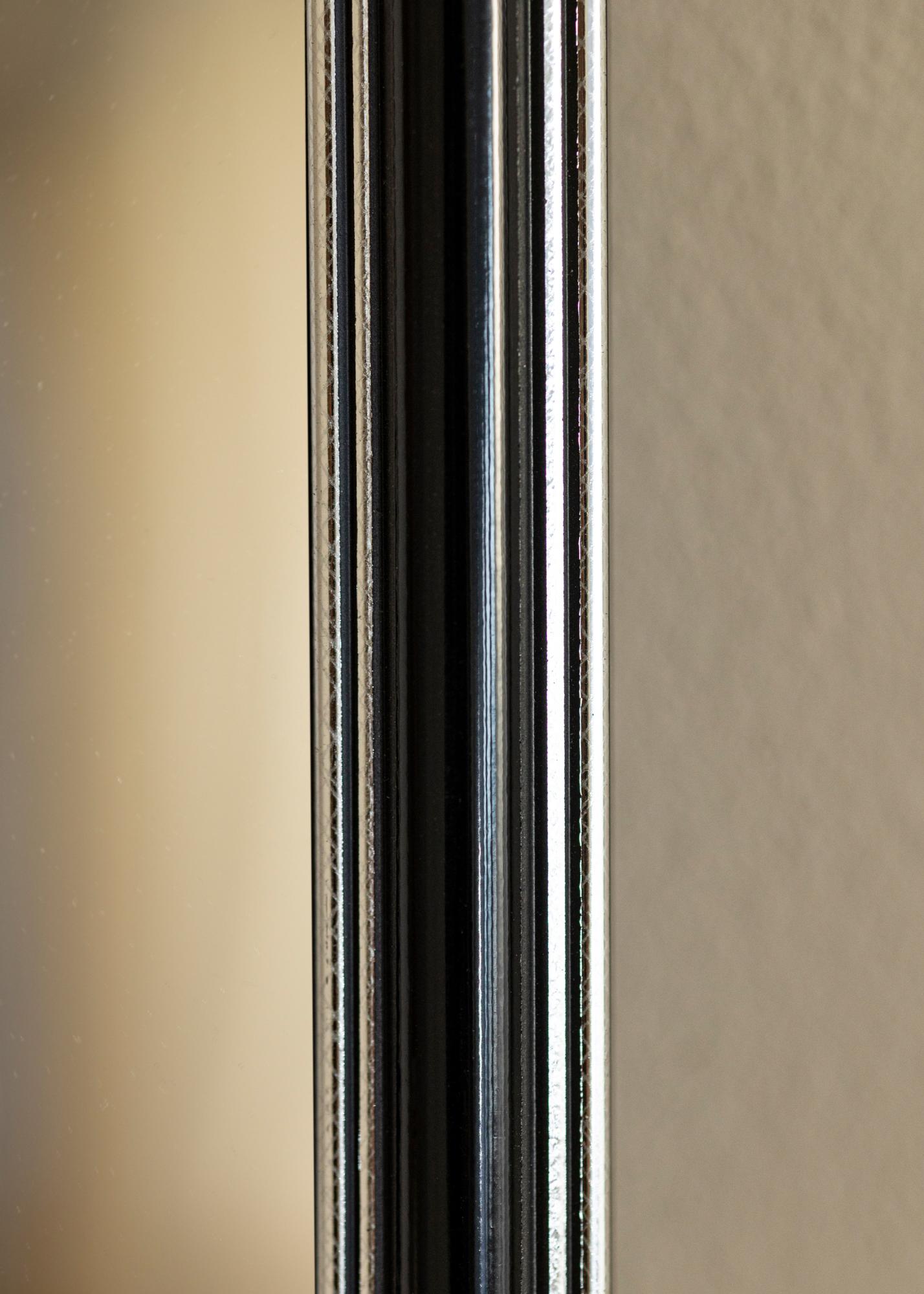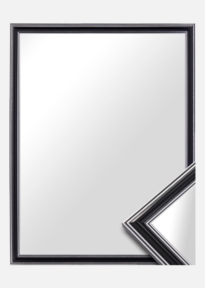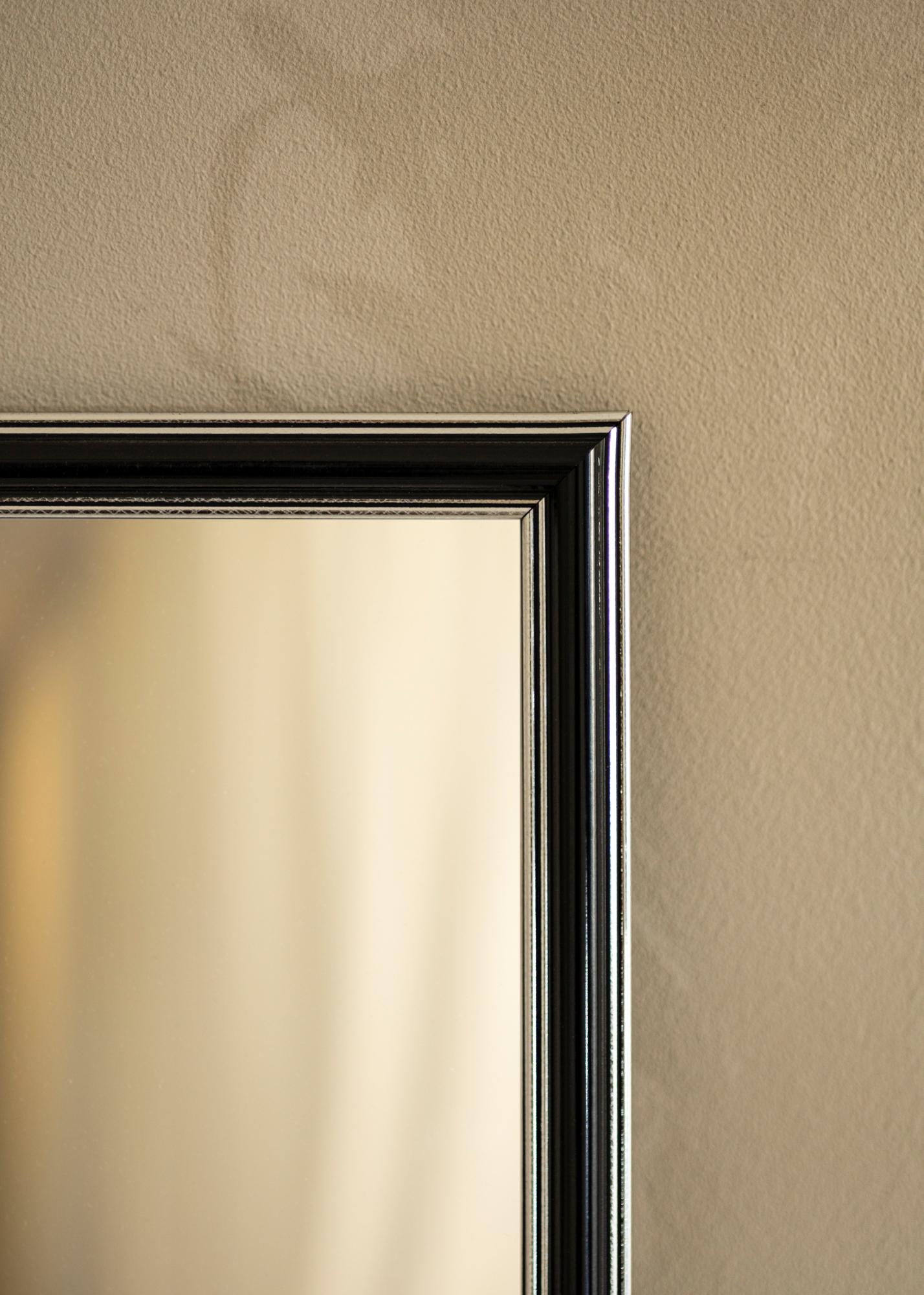 Zaobstarajte si štýlové zrkadlo, ktoré zaručene zapadne tam, kde ho chcete mať! Toto luxusné zrkadlo je vyrobené podľa vašich rozmerov v našej vlastnej rámovej dielni. Čierny stred s postriebrenými okrajmi na vonkajšej strane a blízko skla pridáva mužný nádych. Jednoducho sa hodí k ďalšiemu zariadeniu, napríklad v striebornej, čiernej, bielej a fialovej farbe.