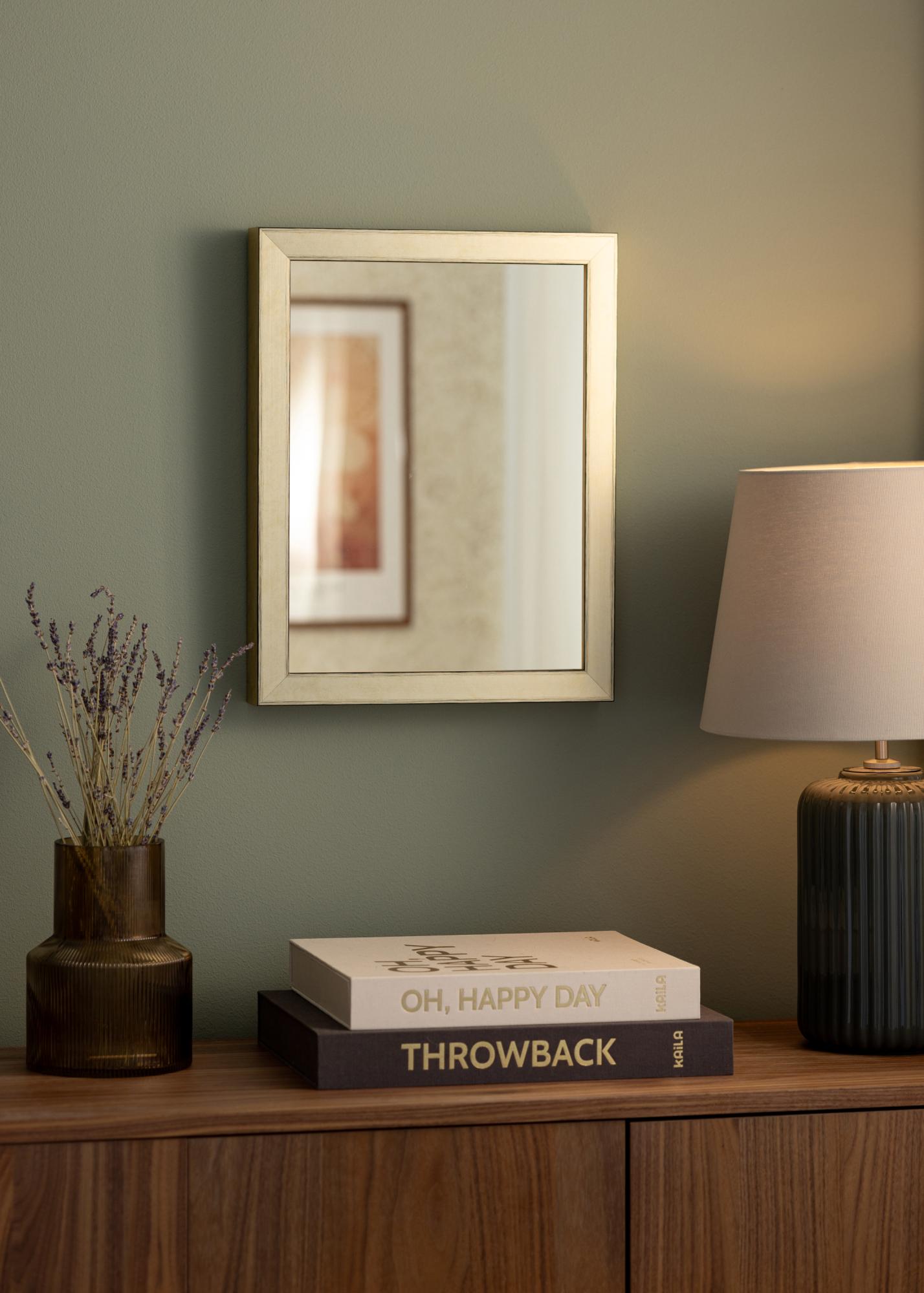 Rám zrkadla Tyr Gold má šírku 30 mm a hĺbku 50 mm, čo zrkadlu dodáva robustný a pevnú pocit. Vyrobené z borovice, kombinuje odolnosť s estetikou. Jemná patina na ráme dáva zrkadlu jedinečný charakter bez toho, aby prebrala izbu, čo z neho robí vynikajúcu voľbu pre všetky typy interiérov.