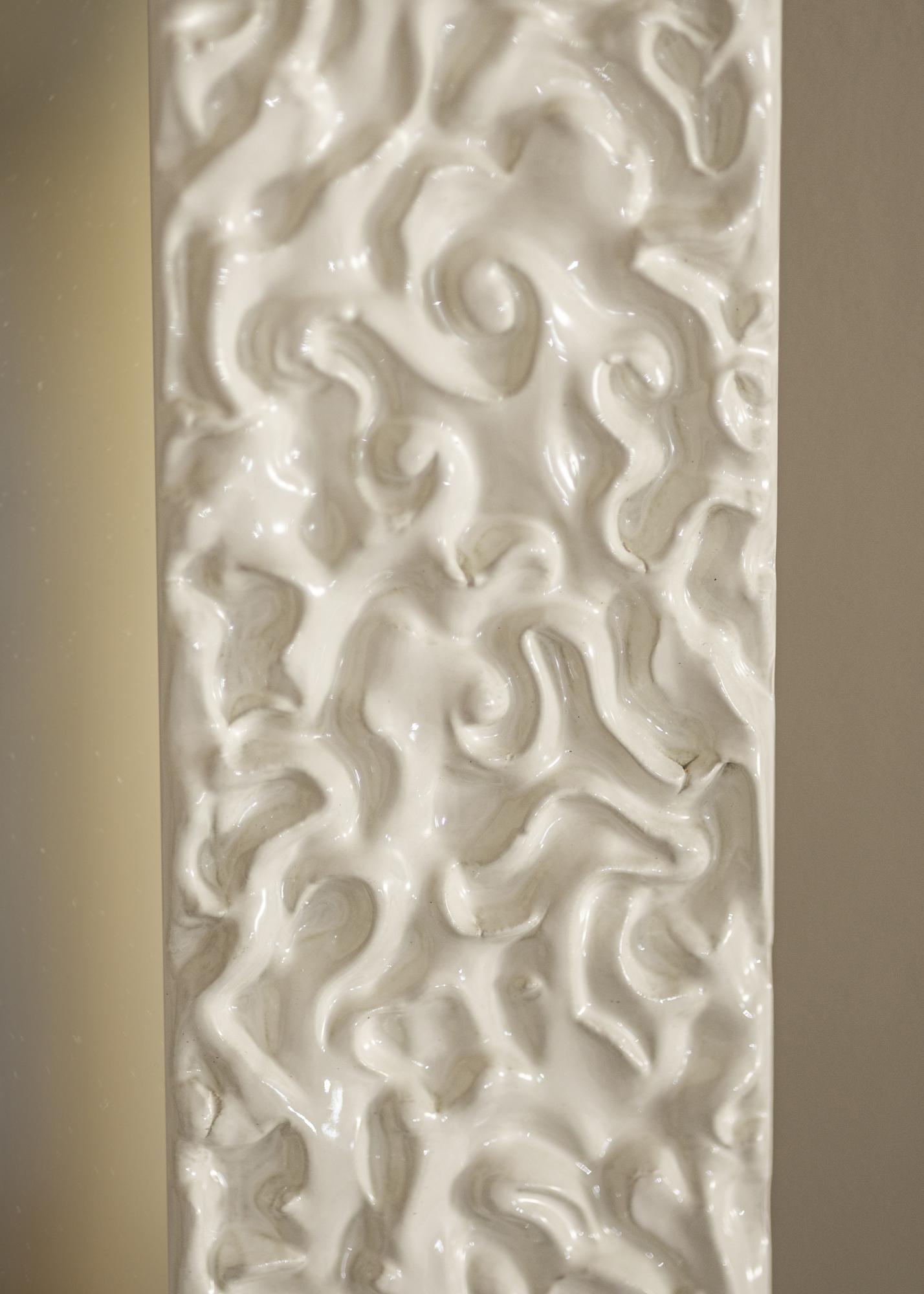 Vysokolesklý biely povrch zrkadla má živý, organický vzor, ktorý vytvára moderný a elegantný dojem. Táto lesklý povrch zvýrazňuje mäkké, plynulé tvary a dáva rámu exkluzívny vzhľad. Je to dokonalé riešenie pre tých, ktorí hľadajú nápadný detail, ktorý kombinuje klasickú inšpiráciu so súčasným dizajnom.