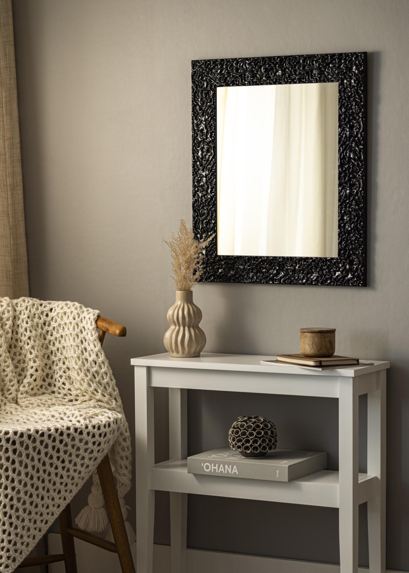 Zrkadlo Westminster Čierne je zrkadlo na mieru, ktoré vyrábame my, čo znamená, že ho môžete získať presne v rozmeroch, ktoré najlepšie vyhovujú vášmu domovu. So svojou hlbokou čiernou farbou a vysokým leskom sa toto zrkadlo stane elegantným doplnkom do každej miestnosti. Rám s 81 mm šírkou poskytuje zrkadlu robustné orámovanie, zatiaľ čo organický vzor na povrchu vytvára živý a dramatický efekt.