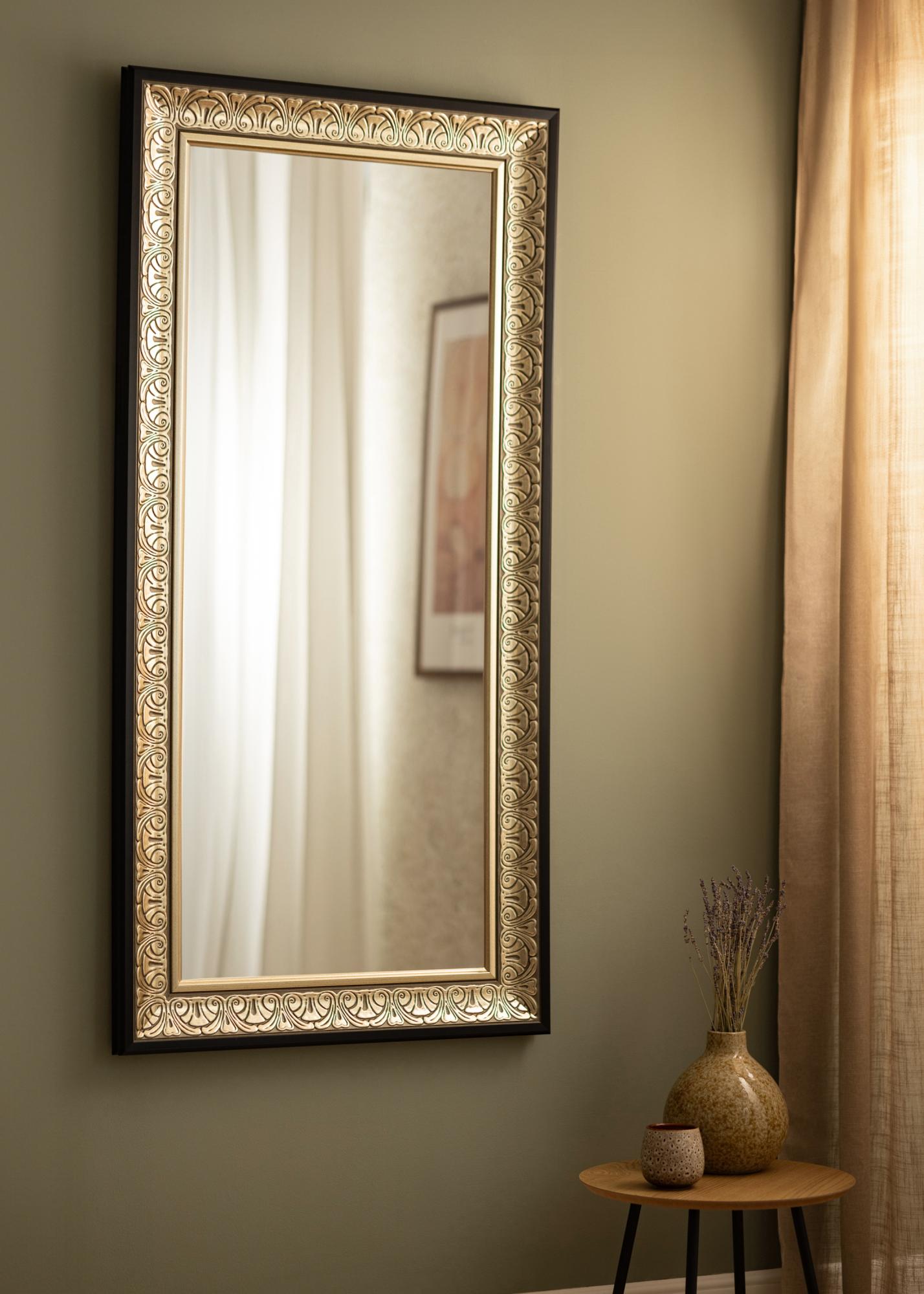 Elegantné striebornosfarbené ornamentálne zrkadlo, ktoré sa hodí rovnako dobre do walk-in šatníka ako do chodby alebo do kúpeľne. Vzhľad rámu okolo zrkadla, s nadčasovým vzorom, umožňuje, aby zrkadlo zapadlo do všetkých typov interiérových štýlov, od romantických pastelovo sfarbených ženských spální až po elegantnejšie a inak minimalistické prostredie, kde zrkadlo vytvára kontrast. Dobré je aj zavesiť ho nad príborník alebo bufet, aby sa dosiahol pocit väčšieho priestoru v miestnosti.
